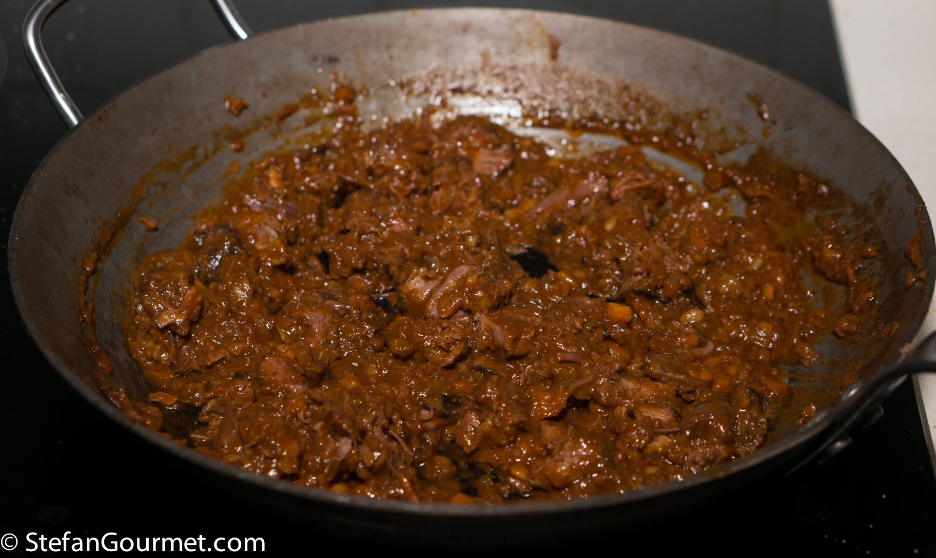 As I’ve shown in this post you can cook the oxtail sous-vide with the tomato sauce, and then the tomato flavor will penetrate all the way into the meat. For this version I decided to cook the oxtail separately and only mix it with the sauce in the end, and mixing the sous-vide juices with the tomato sauce. This makes for a more interesting flavor profile, because the oxtail stays more beefy inside the tomato sauce.