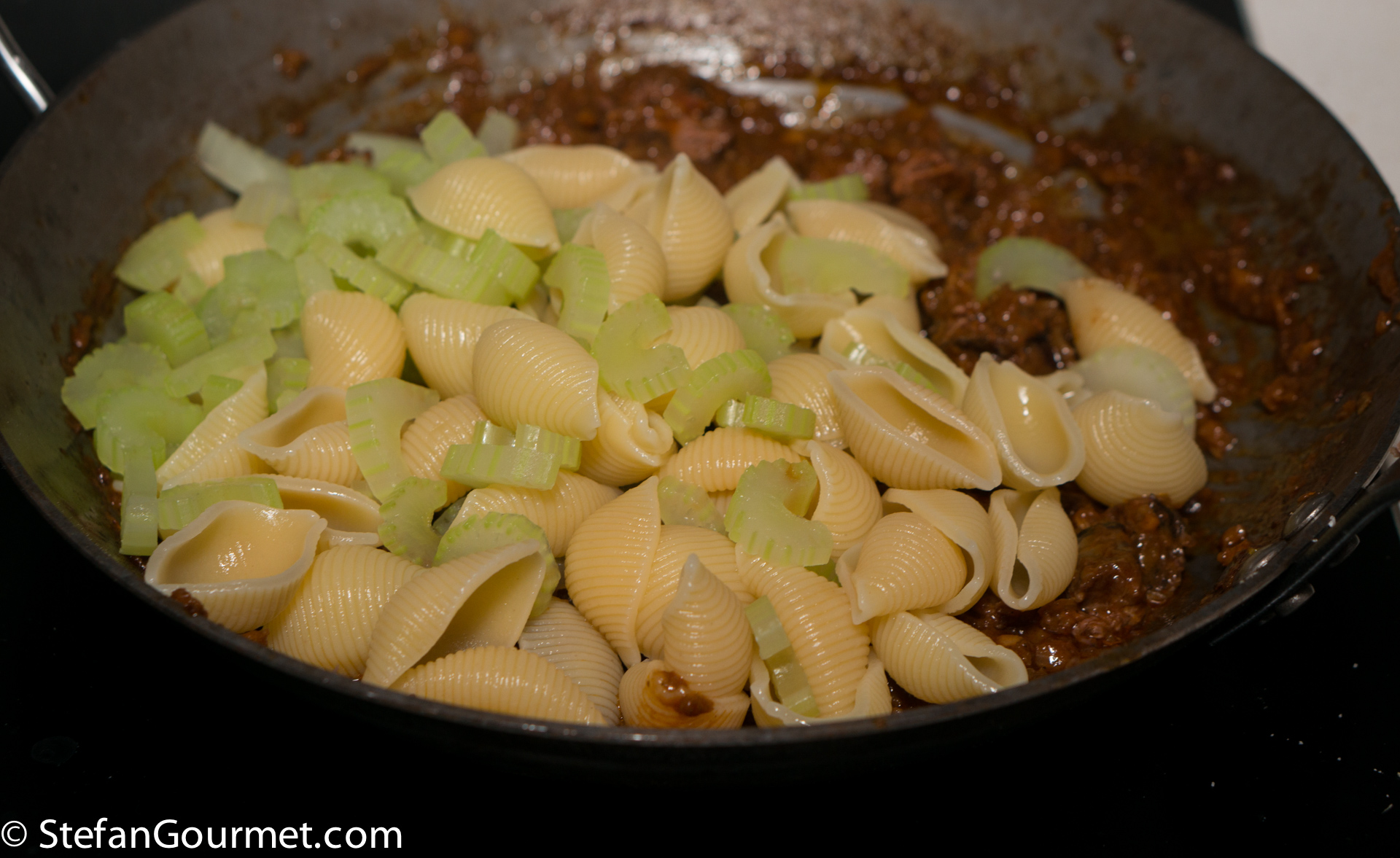 When the timer beeps, drain the pasta and celery, and add it to the sauce in the pan.