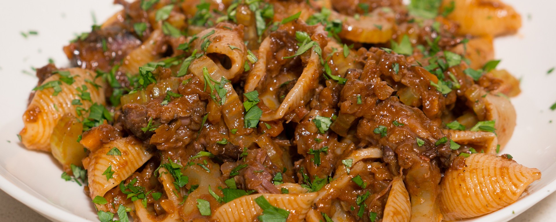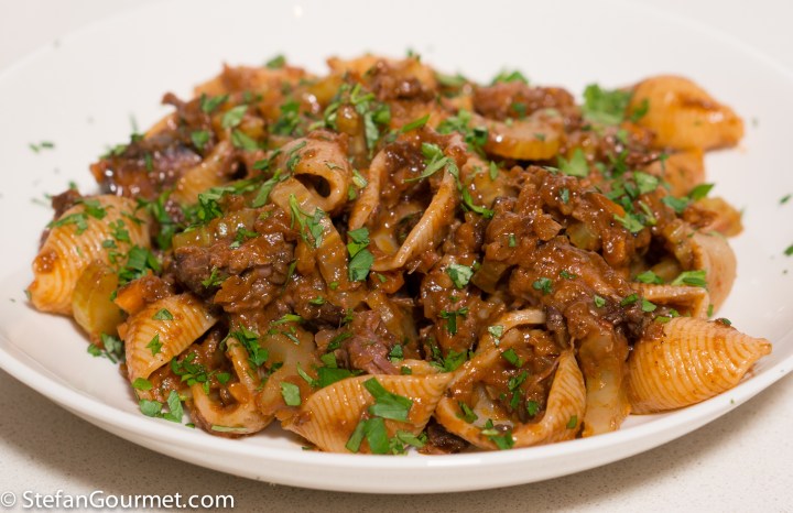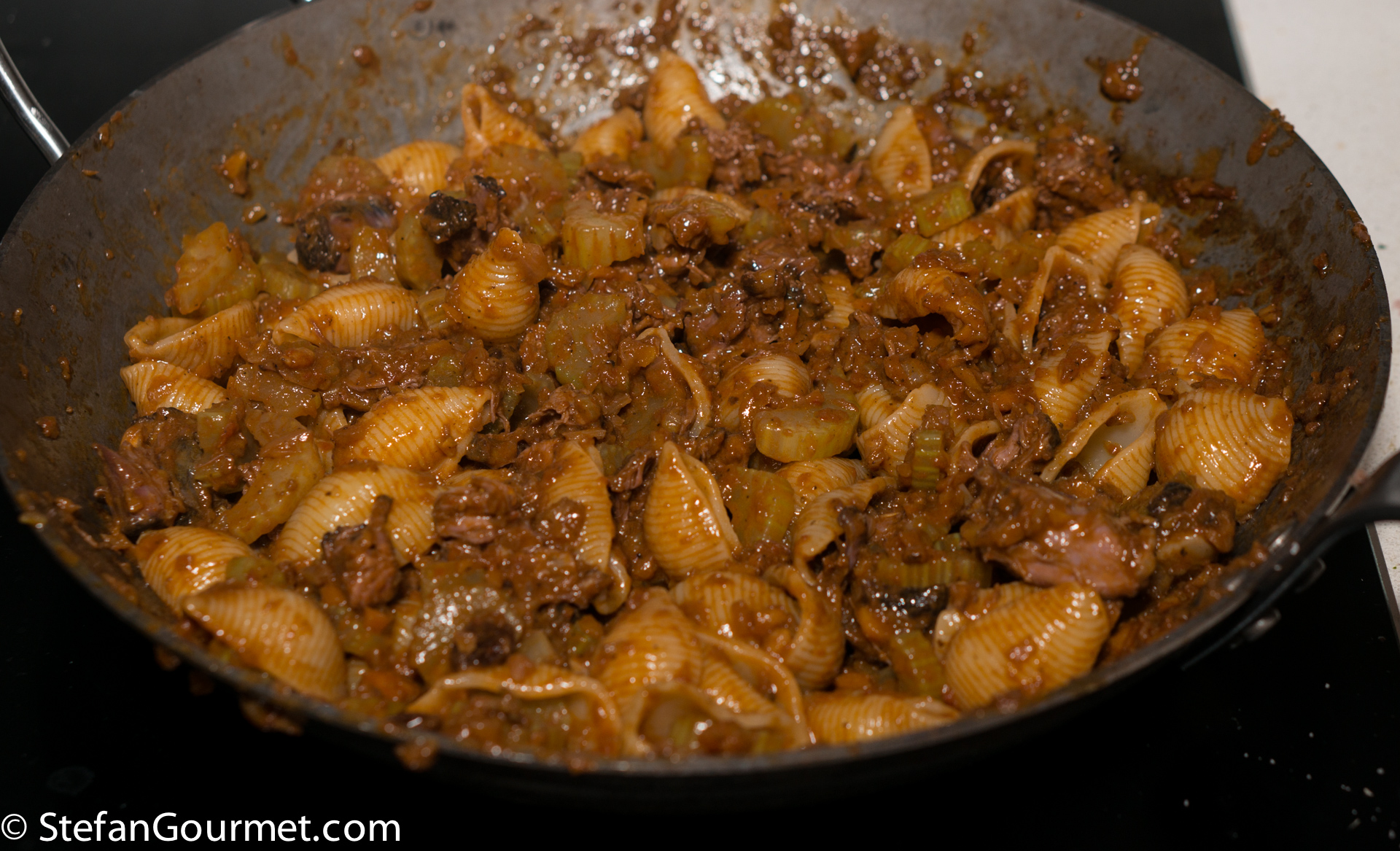 Finally a note on the pasta shape. In Rome the most usual pasta shape for this would be rigatoni. I thought that conchiglie rigate (ribbed pasta shells) would work even better, because they have the ideal shape to ‘absorb’ the pieces of oxtail meat in the sauce. But you can make this with any short pasta of your choice.