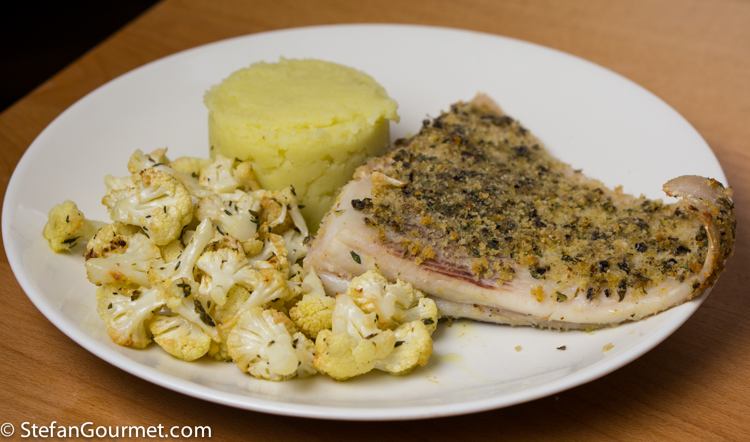 This skate is cooked Italian style with a crust of breadcrumbs, capers, olives, lemon zest, thyme and garlic, and served with roasted cauliflower and mashed potatoes.