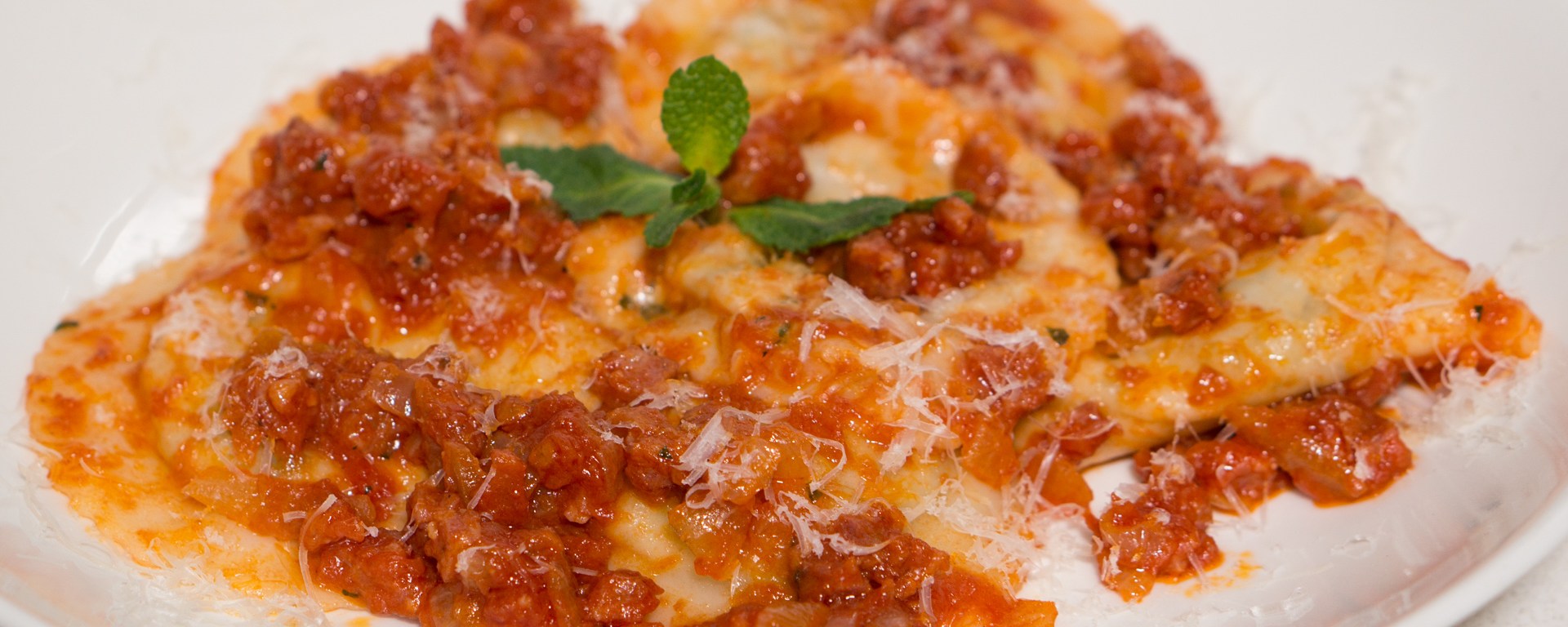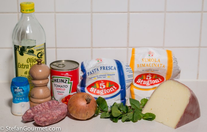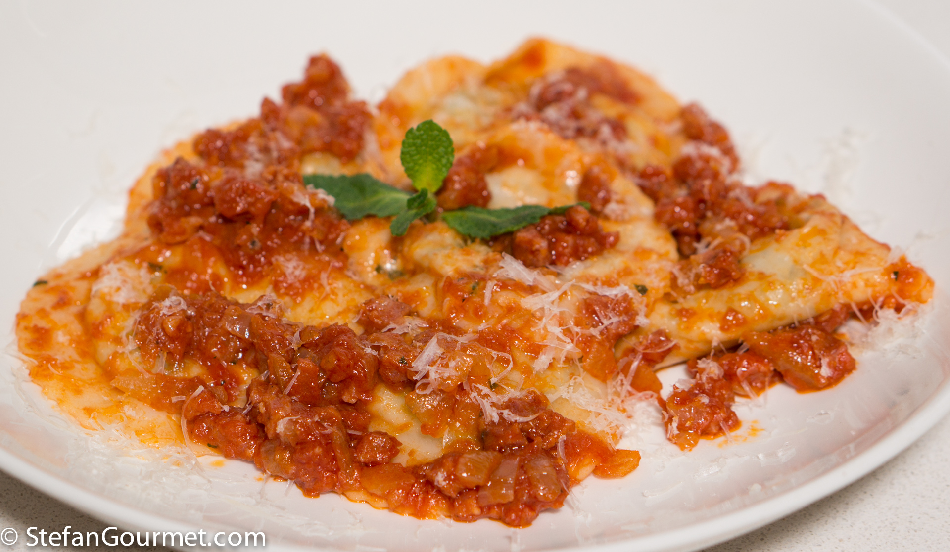 Dorgali is a town in the mountains on the east coast of Sardinia. We were staying at the seaside resort of Cala Gonone, but drove up to Restaurant Ispinigoli in the mountains to try the local cuisine. (If you ever go to that region, make sure to eat at the restaurant. The food is simple but delicious, like Italian food should be. And the view on the sea down below is marvelous.) As soon as you are away from the coast, the Sardinian cuisine is mostly meat-oriented rather than seafood. We tried the typical ravioli of Dorgali, which are stuffed with local pecorino (sheep’s milk cheese) and fresh mint, and served with a sausage and tomato ragù. So this is yet another installment in the series of dishes inspired by our trip to Sardinia. These ravioli are outstanding: so simple and yet so tasty and elegant.