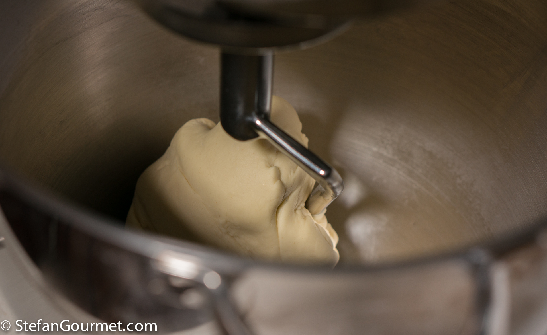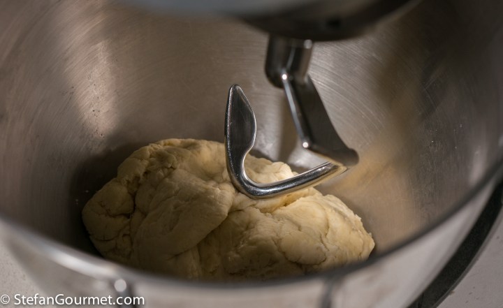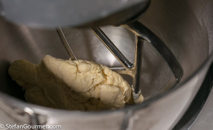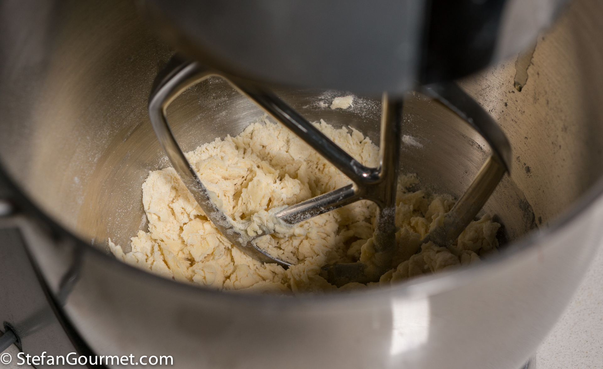 Mix with the paddle attachment, adding water drop by drop if needed to let the dough come together. Be patient and do not add more water than necessary. If the dough becomes too sticky anyway, add a bit more flour.