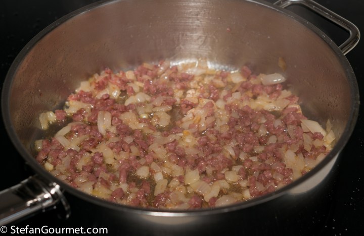 Make the ragù while the ravioli are drying. Heat 2 tablespoons of olive oil in a frying pan. Add a chopped onion and season lightly with salt. Stir until the onion is translucent, about a minute.