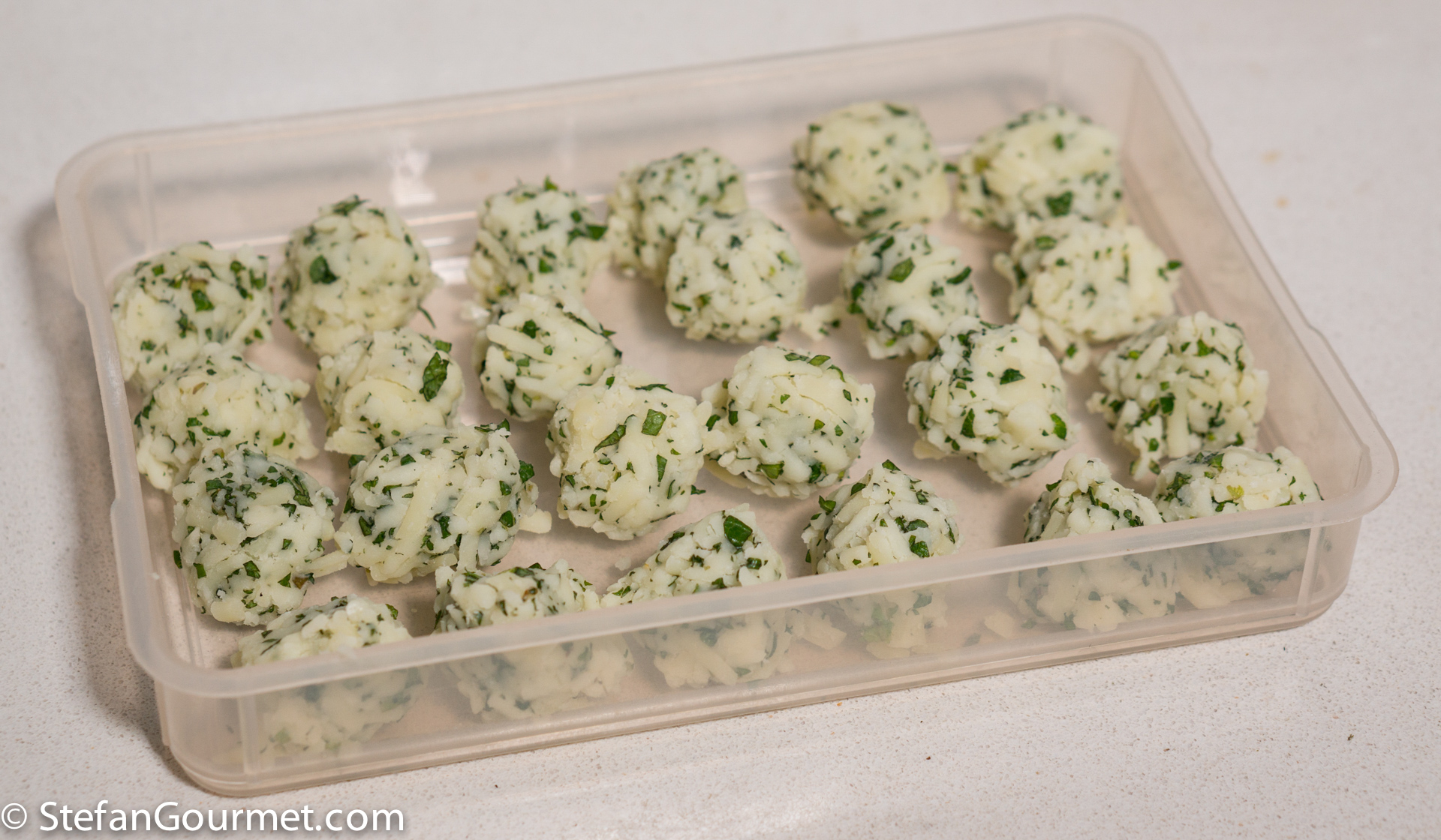 To make the filling, mix 240 grams of freshly grated cheese with 2 tablespoons of minced mint. Then divide the mixture into 24 balls of equal size.