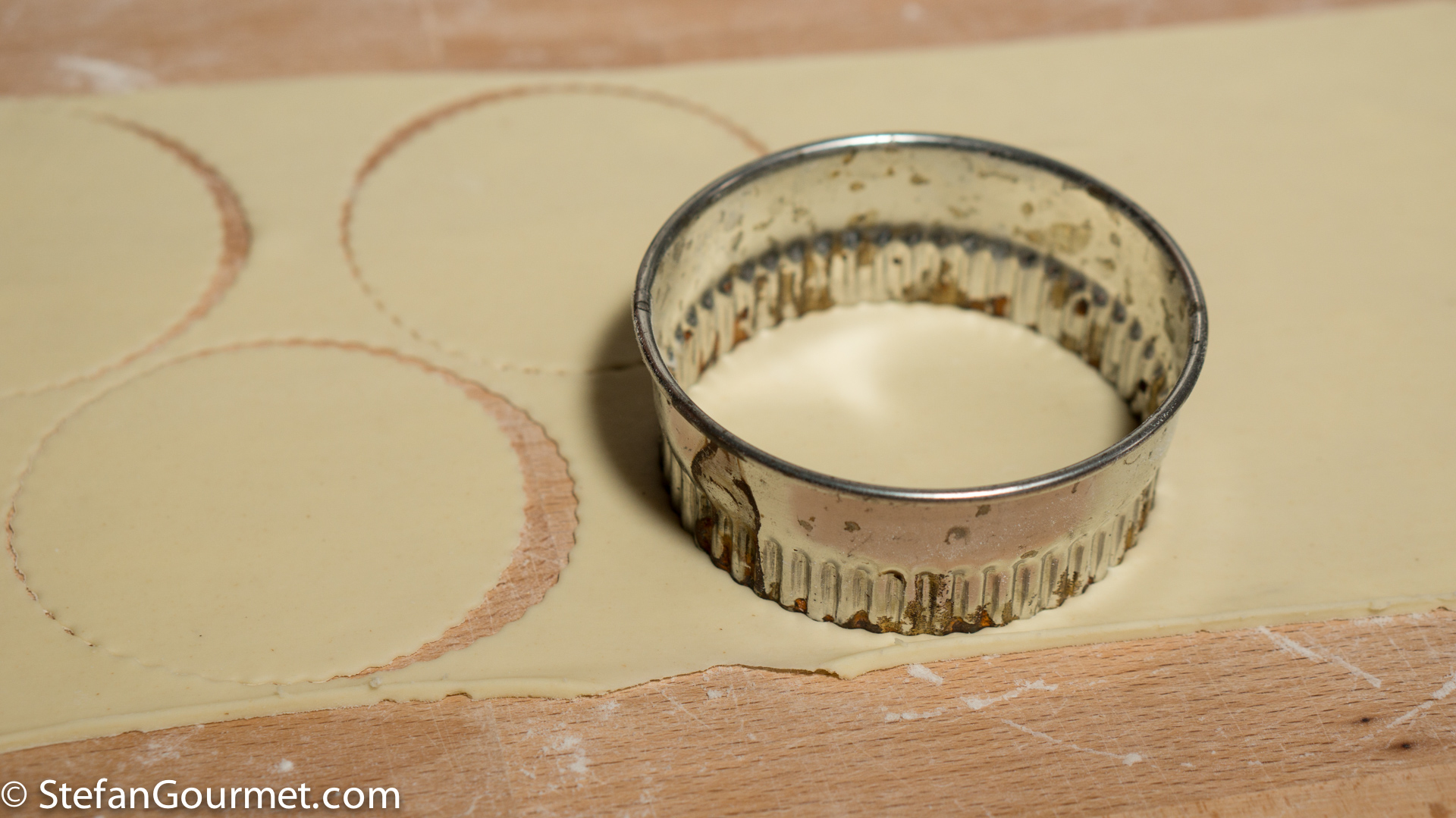 Use a cookie cutter with a diameter of 80 mm (3.25″) to cut circles out of the dough. (Gather the scraps and roll them up to re-use.)