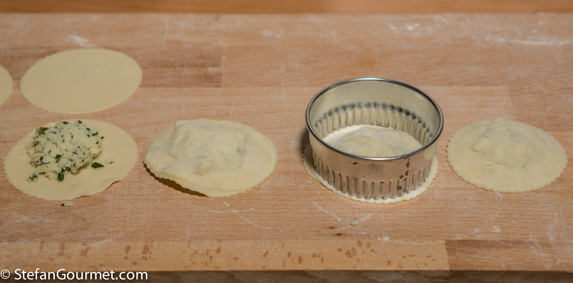 Flatten a ball of filling and put it on the center of a circle of pasta. Cover it with another circle, ‘stroking’ along the filling to remove any trapped air and pressing down with your fingers to seal them well. Then use a slightly smaller cookie cutter of 75 mm (3″) to trim the edges. (Gather up the scraps and roll them up to re-use.)