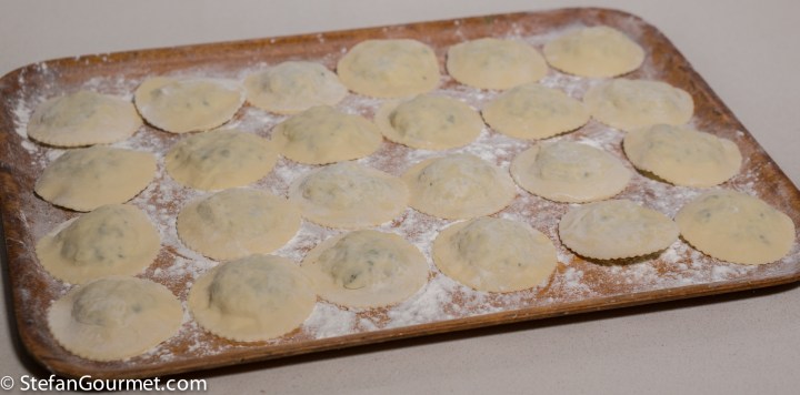 Arrange the ravioli on a sheet tray that was sprinkled with flour. Make sure to turn the ravioli after half an hour or so, so they can dry on both sides. If you forget to do that, they may get stuck.