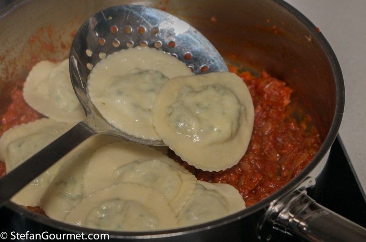 Lift the ravioli out of the pot with a skimmer as soon as they are cooked, and place them in the pan with the ragù.
