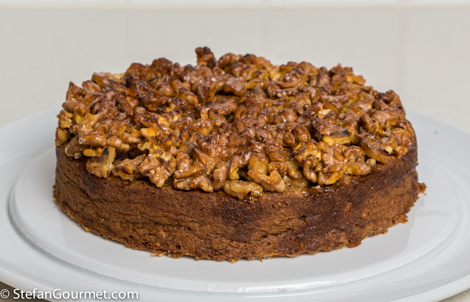 This parsnip and walnut cake is just right for the season, very tasty and gluten free. To brighten up the woody flavors it includes ground aniseed. The walnuts on top are flavored with maple syrup and a pinch of salt.