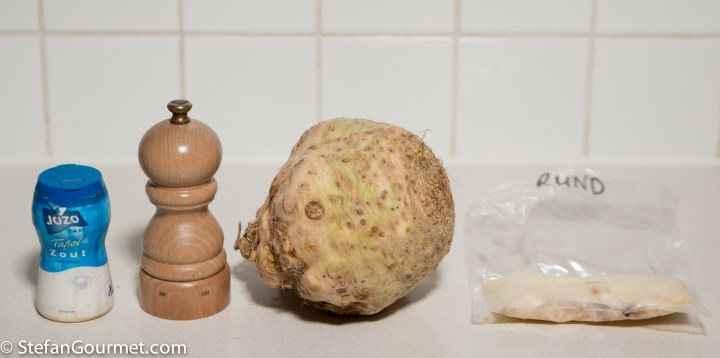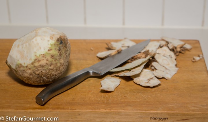 celeriac (this one was 600 grams/1.3 lb after peeling and enough for 4 servings as a side dish)