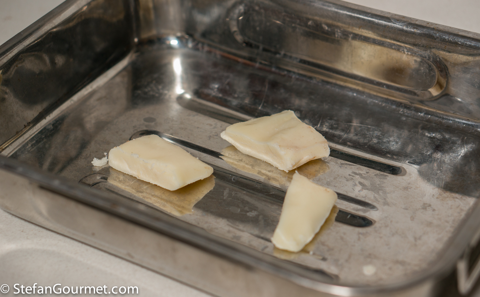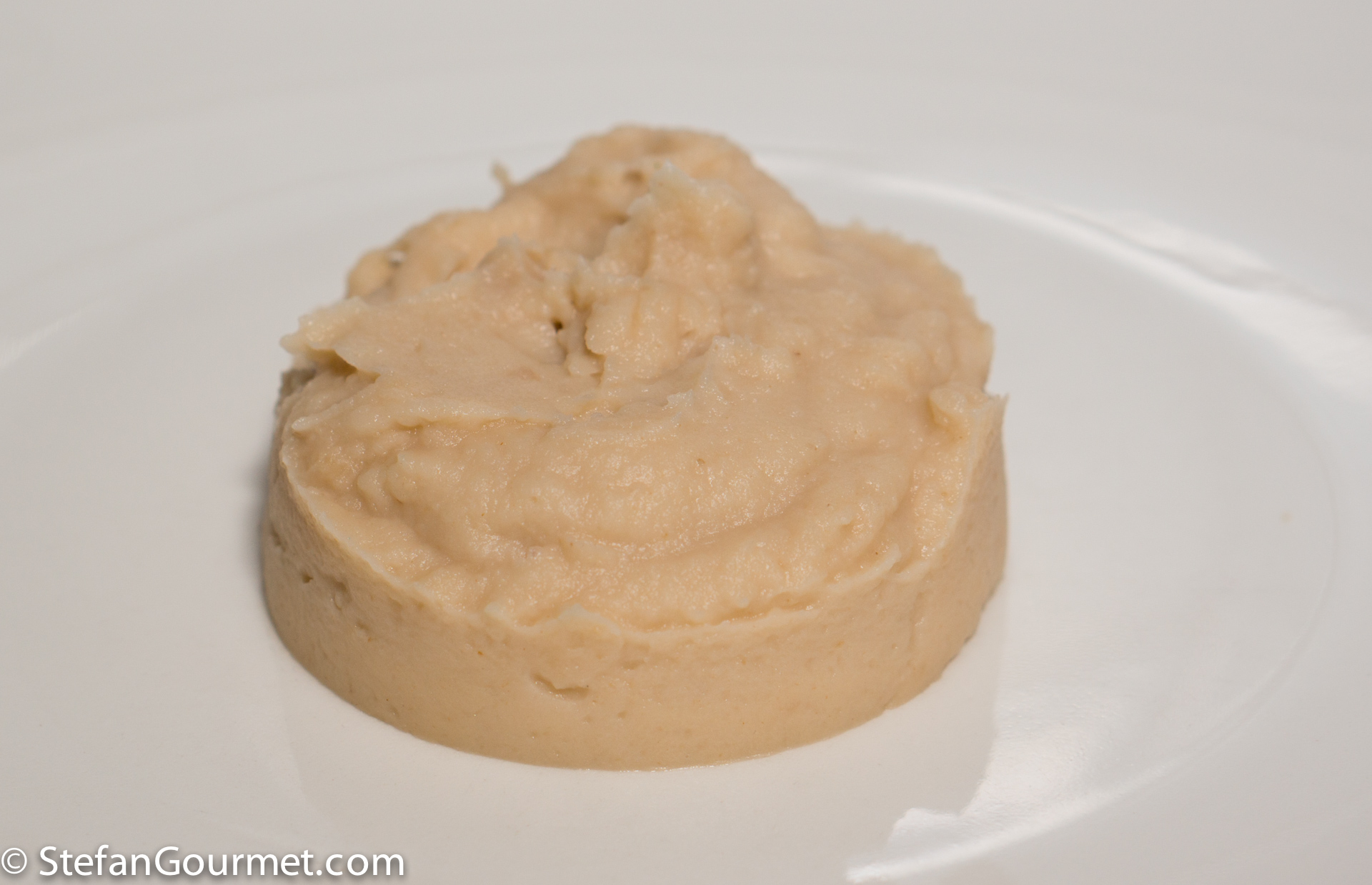 Celeriac, also known as celery root, is a winter vegetable that is easily available here and so it ticks the boxes of seasonal and local. A great way to serve it is as a puree. Now you can make this puree by steaming the celeriac or cooking it sous-vide, but if you roast the celeriac in the oven you can get some nice browning to deepen the flavor. Since I used this as a side for beef short ribs, I thought it would be fitting to use some of the leftover beef fat to cook it with. This beefs up the flavor, or so to speak. But if you’d prefer a vegan or vegetarian version (and I haven’t scared you off with the photo below), then you could easily replace this with olive oil. Celeriac come in various sizes, so adjust the amounts of the other ingredients accordingly. This is a great side dish for the holidays that works with both meat and fish.
