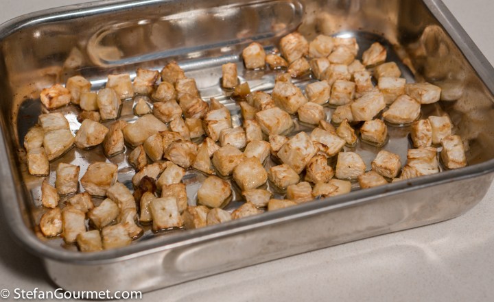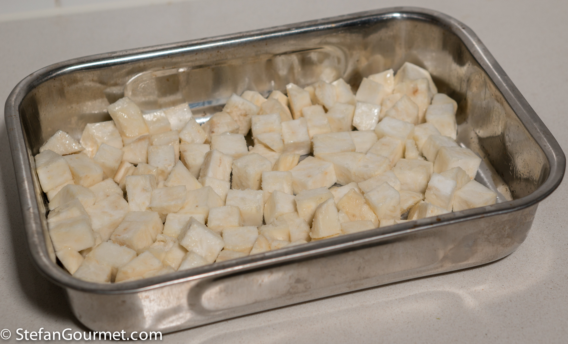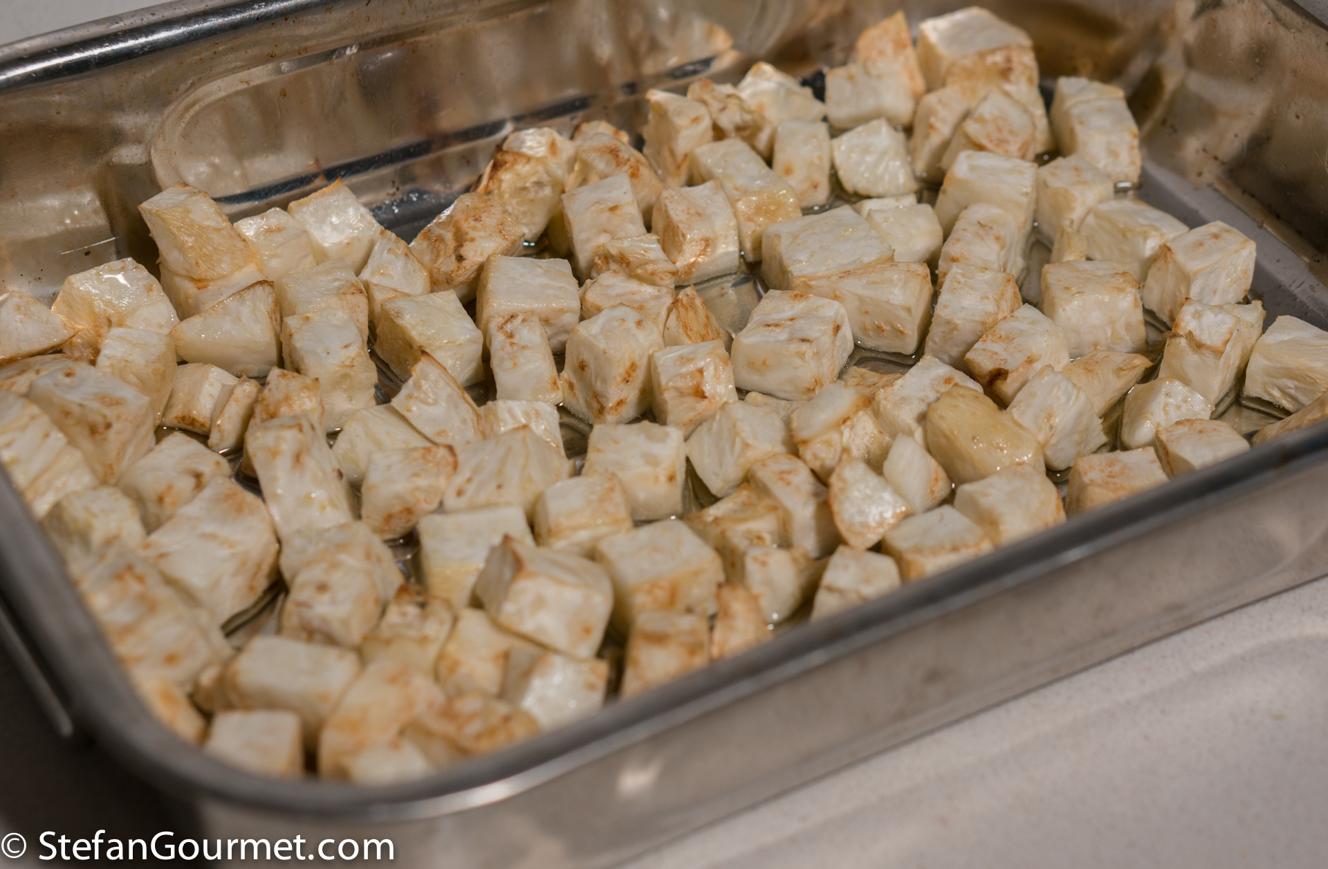 Toss the diced celeriac in an oven proof dish with melted beef fat or olive oil.