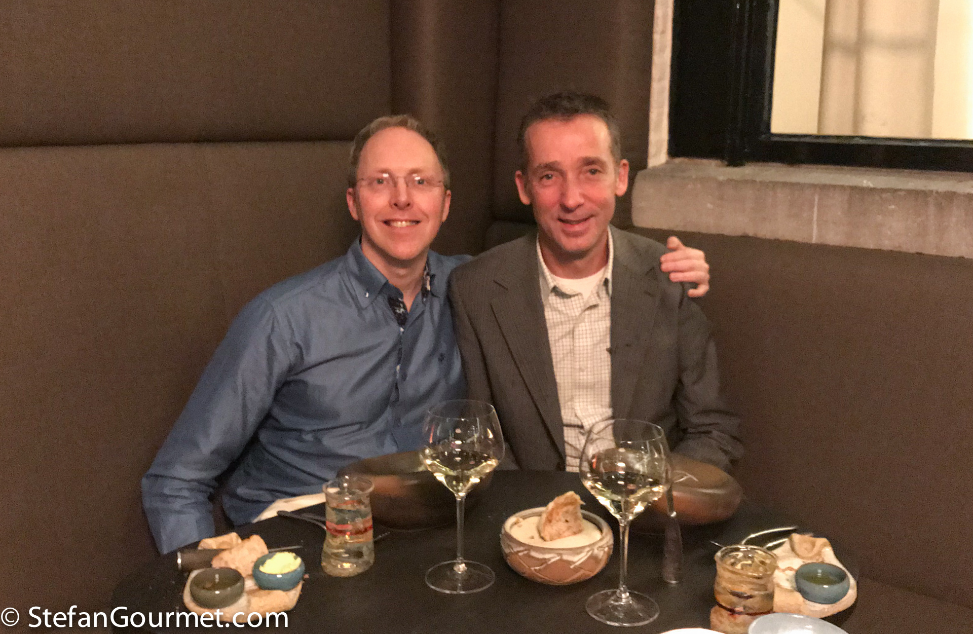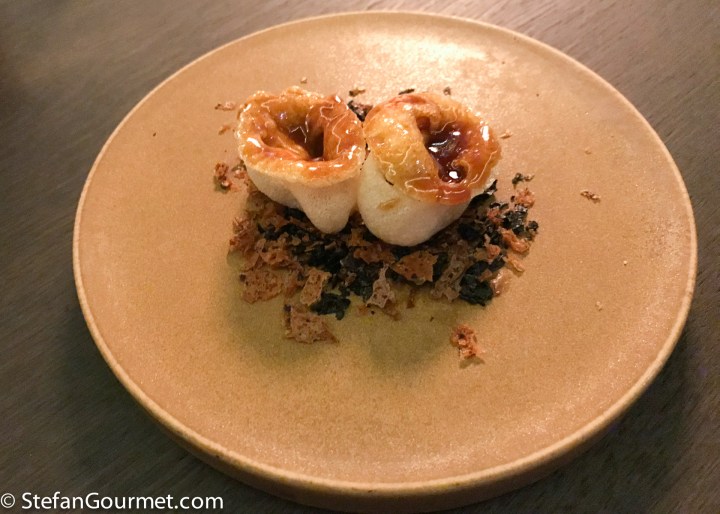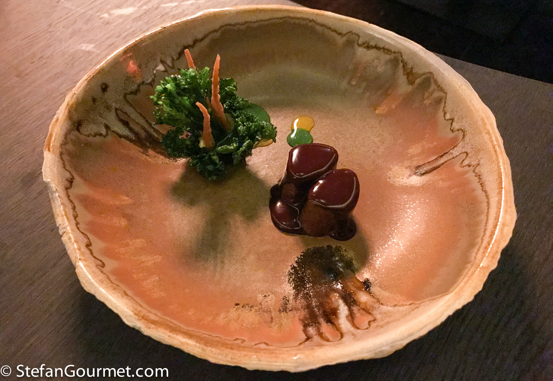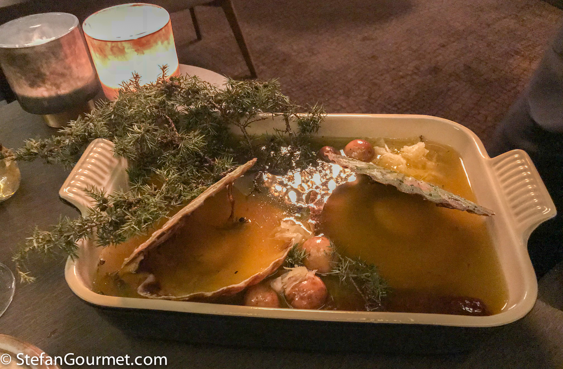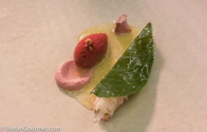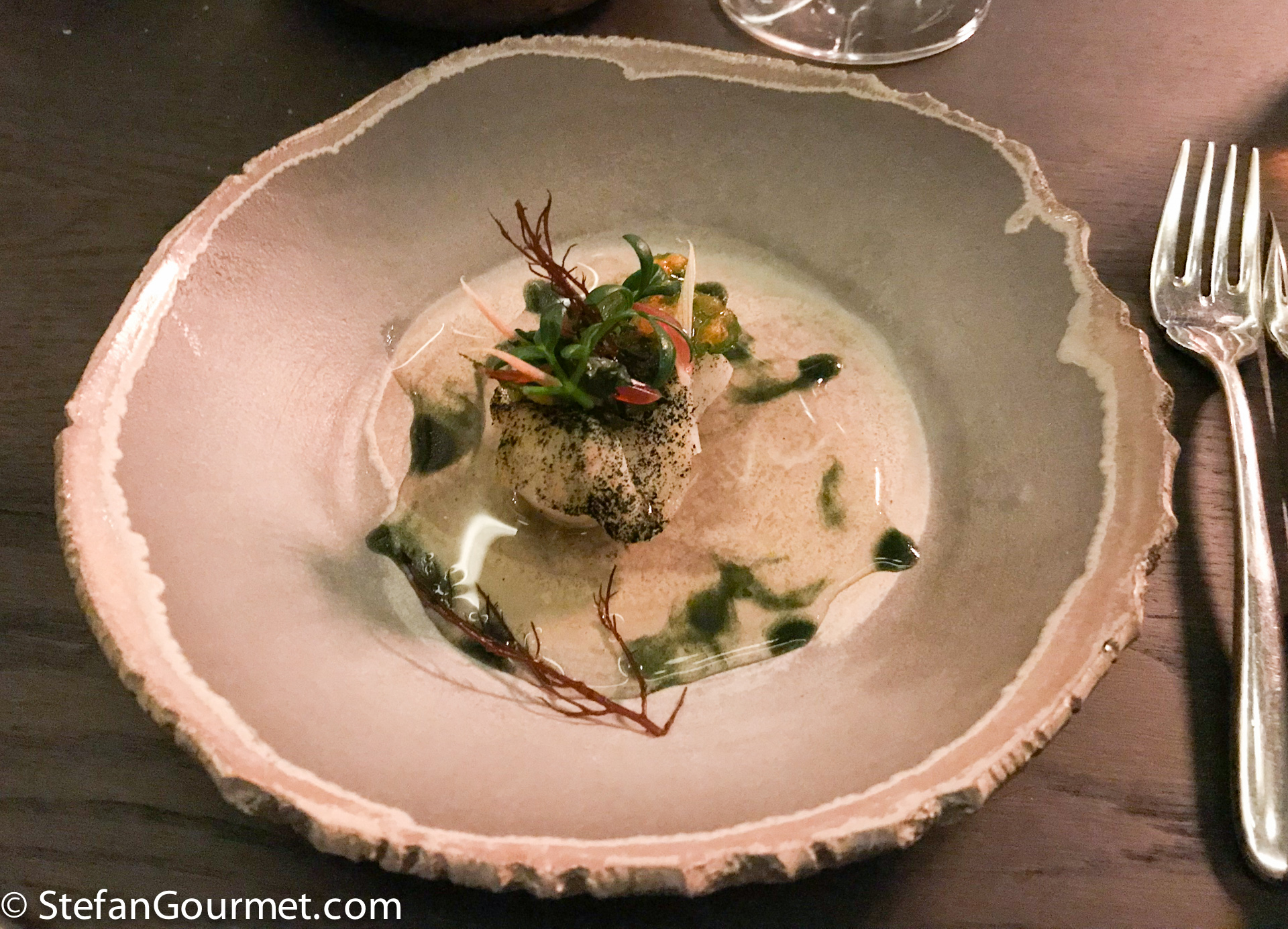 The degustation menu started with exactly the same dish as last year: veal heart tartare, crab, chicken liver, and smoked celeriac juice. Still as good as last year: The combination of flavors on this dish is absolutely wonderful, the smoky juice, the tender crab, the velvety liver, the succulent tartare. What a start, 10/10.” It was paired with another wine: an outstanding Grüner Veltliner from Wachau that became even better with the dish.