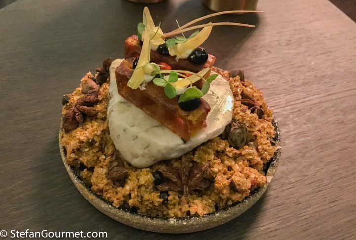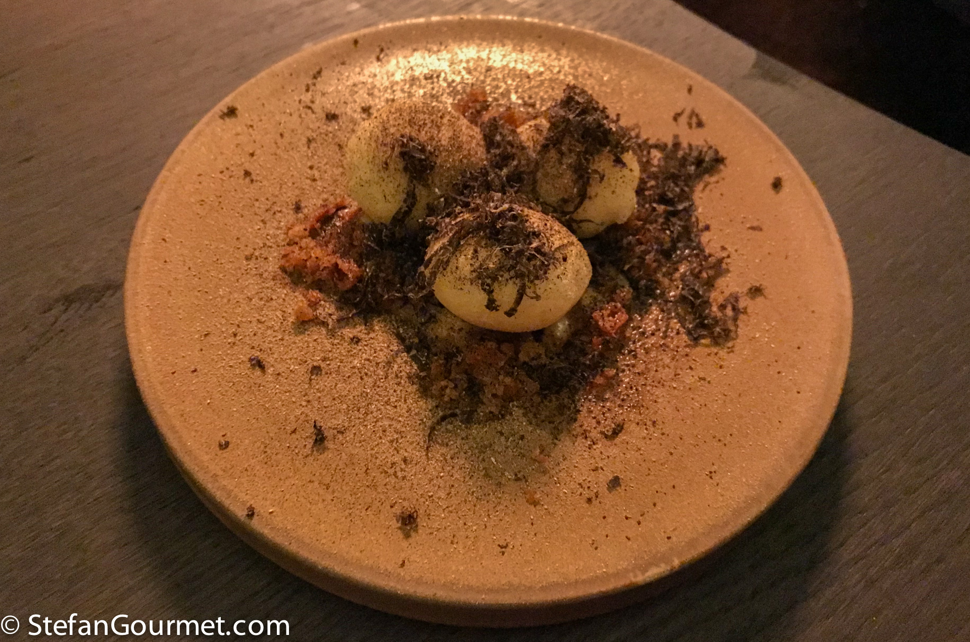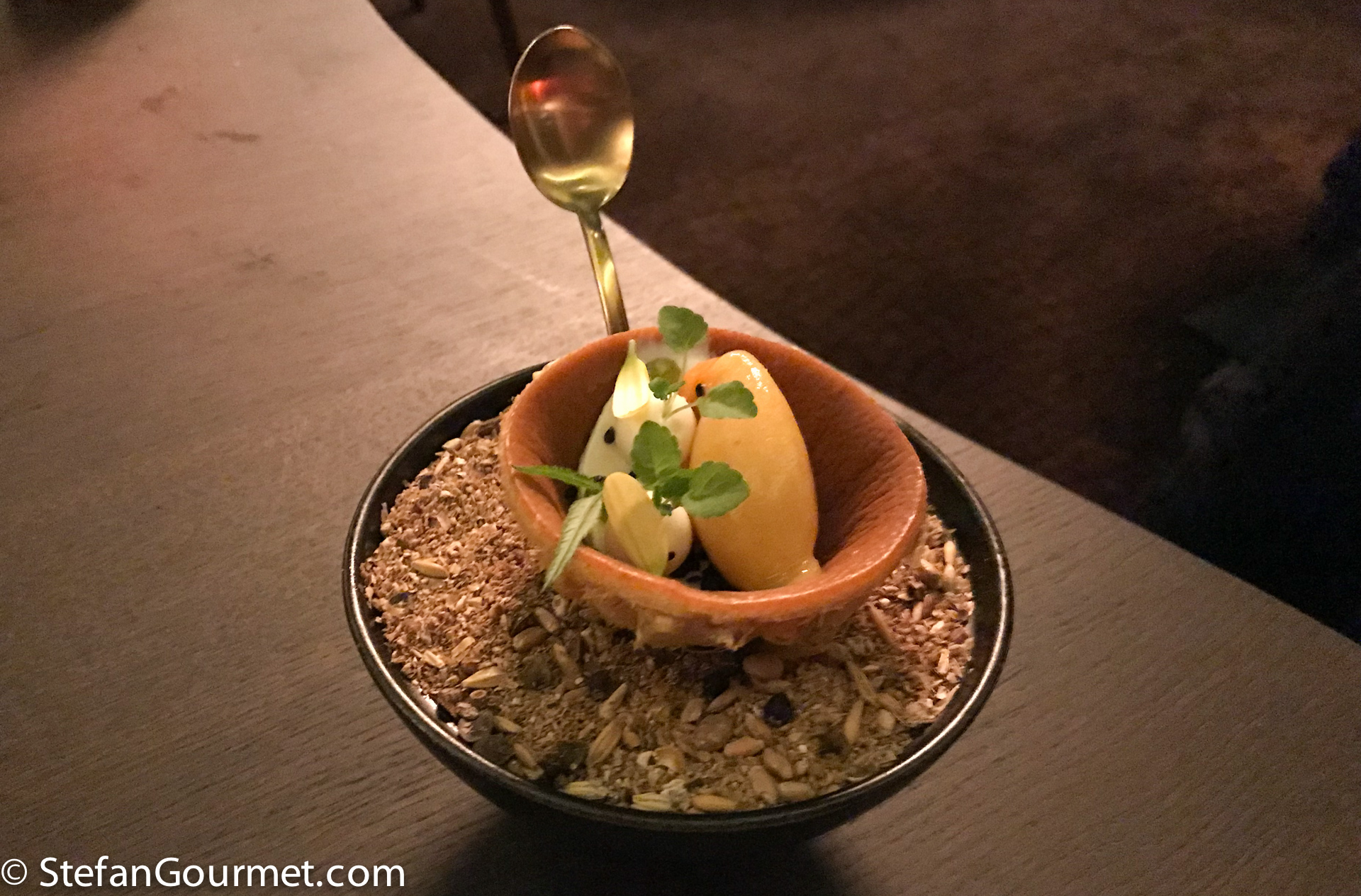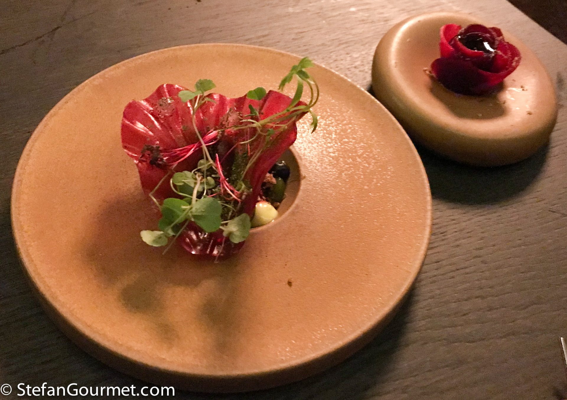 A very nice dessert, not too sweet: beetroot (one of Jonnie’s favorite ingredients, so it had to show up sooner or later) with rose and lovage. The sweet moscatel from Spain took this over the top, what a great pairing. 10/10