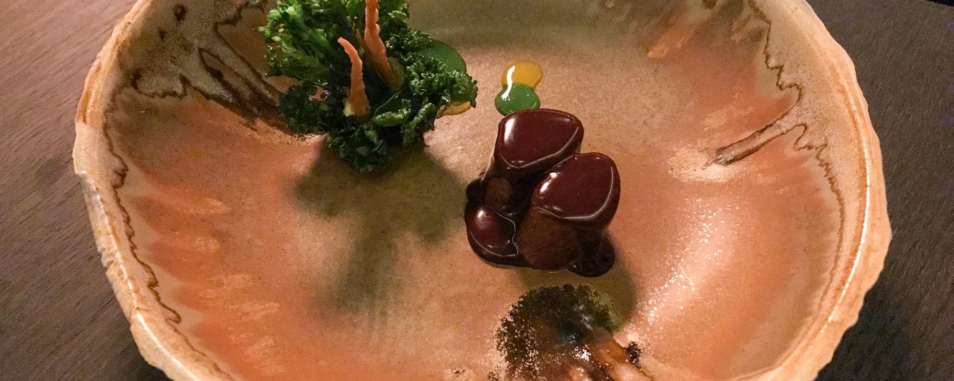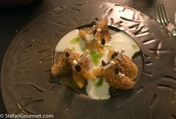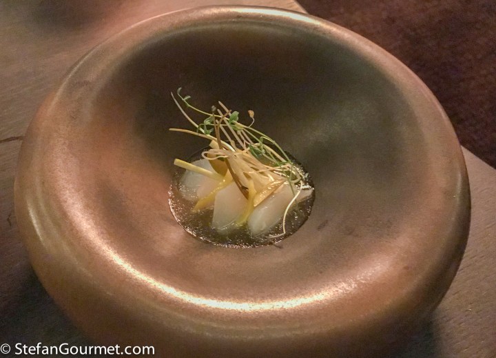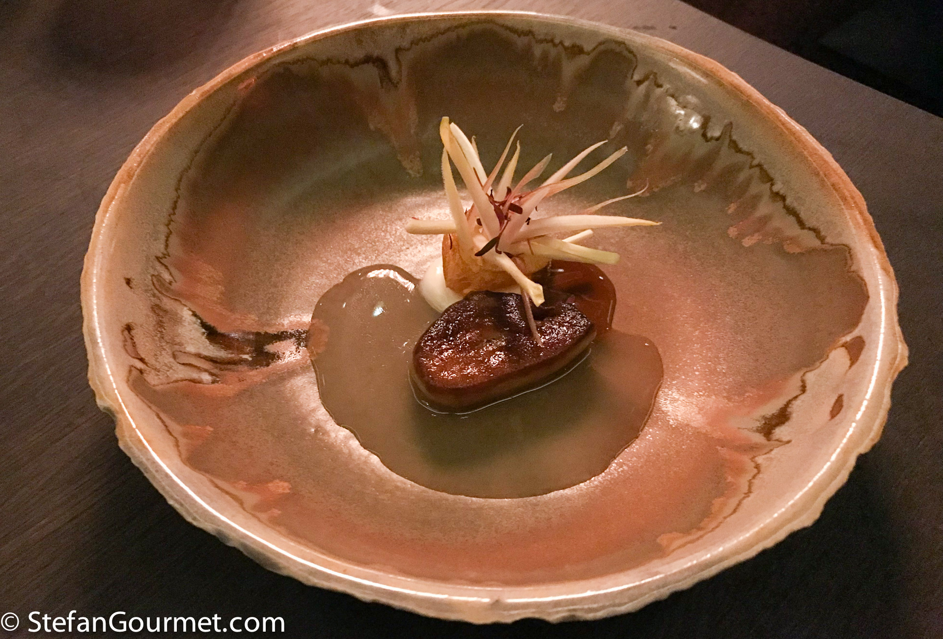 Langoustine ceviche, with kombucha used instead of citrus juice and sea weed, paired nicely with a sauvignon blanc/semillon blend from South Africa. I think I liked last year’s langoustine dish slightly better. 8/10