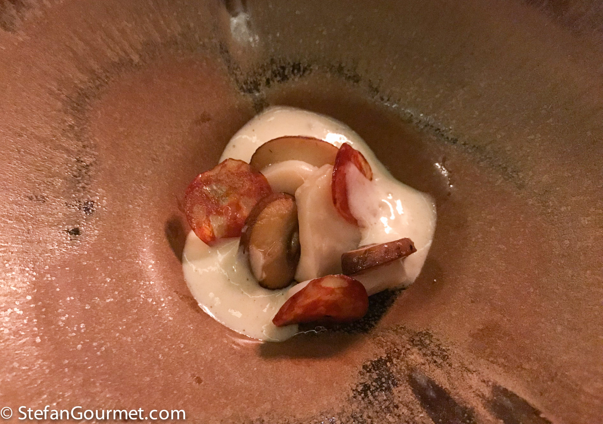The kitchen showed how the next dish was prepared (notice the difference with the plated dish in the next photo!): scallops with mushrooms, spruce, sausage, and sauerkraut, all poached in clarified butter.
