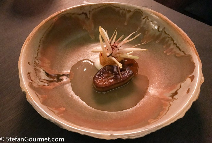 Foie gras with litchi and apricot kernel, paired well with a slightly sweet Mosel riesling. Nice combination, 9/10.