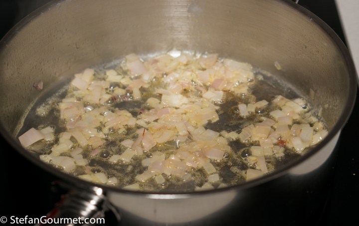 Start by making the shrimp stock. Melt a tablespoon of butter in a frying pan. When the butter foams, add a minced shallot, and stir over medium heat until the shallot is translucent.