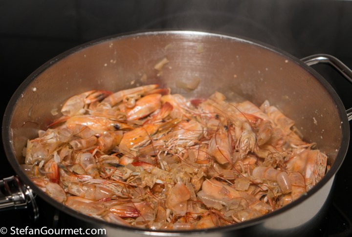 Stir over high heat until the shrimp heads and shells are pink all over.