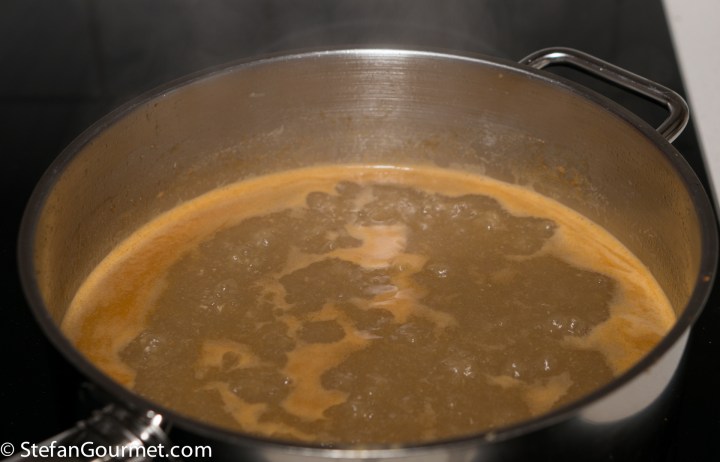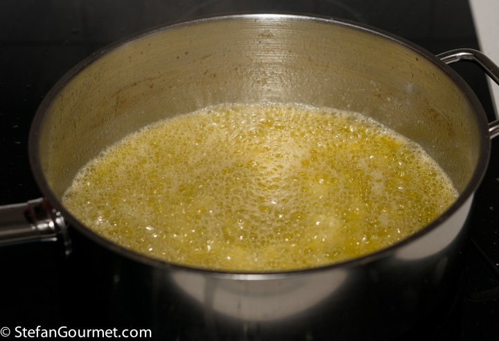 Melt 80 grams of butter in a frying pan. Allow it to foam, but make sure it won’t brown.