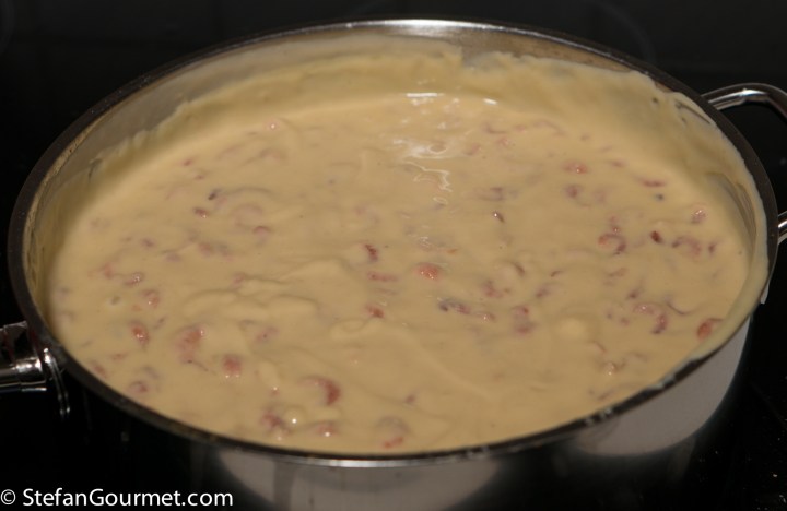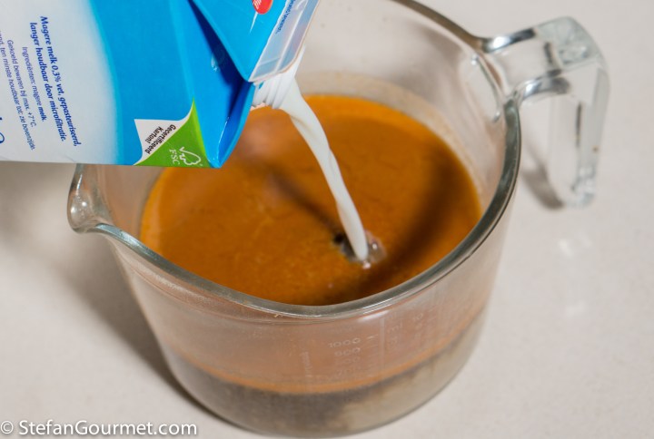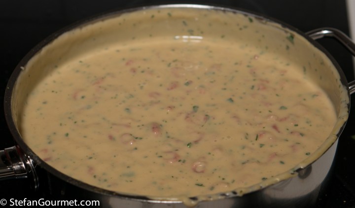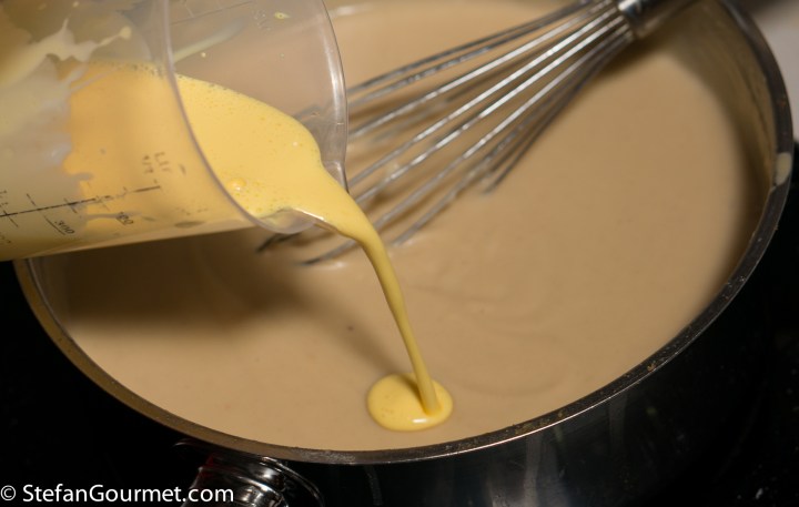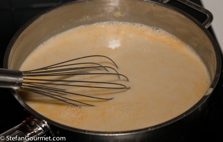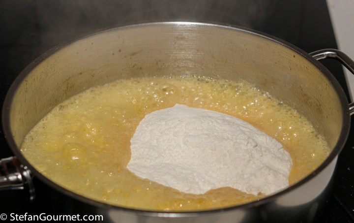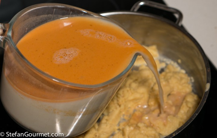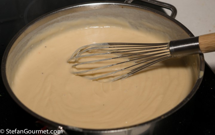 Now add the shrimp stock and milk mixture all at once. (Most recipes will tell you to add it slowly, but that is not necessary and even makes it more difficult. The temperature of the liquid doesn’t matter much either.)