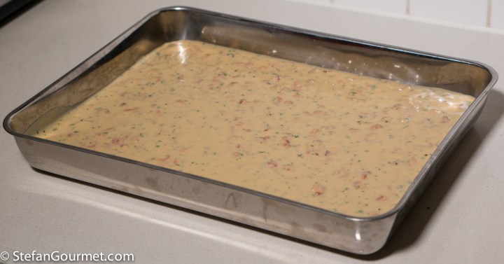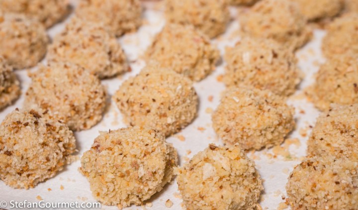 The next day, the ragoût should have firmed up. Now you can easily divide it into 32 equal pieces for balls or 16 for croquettes using a knife. (Note that I made a double batch of 64.)