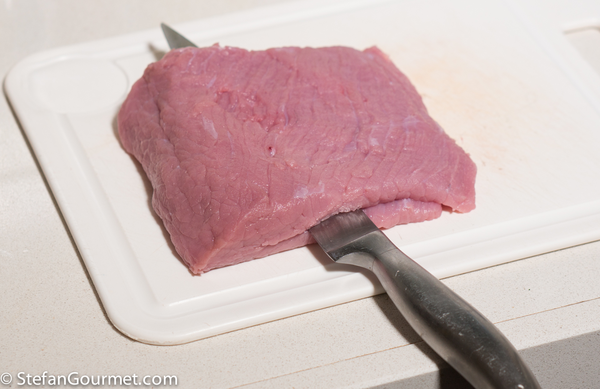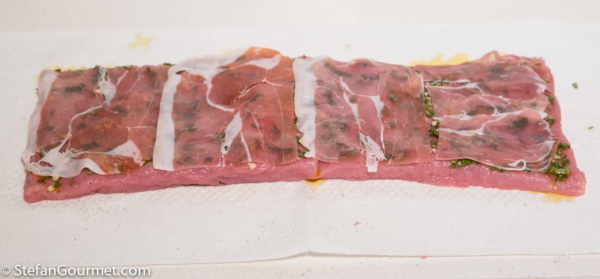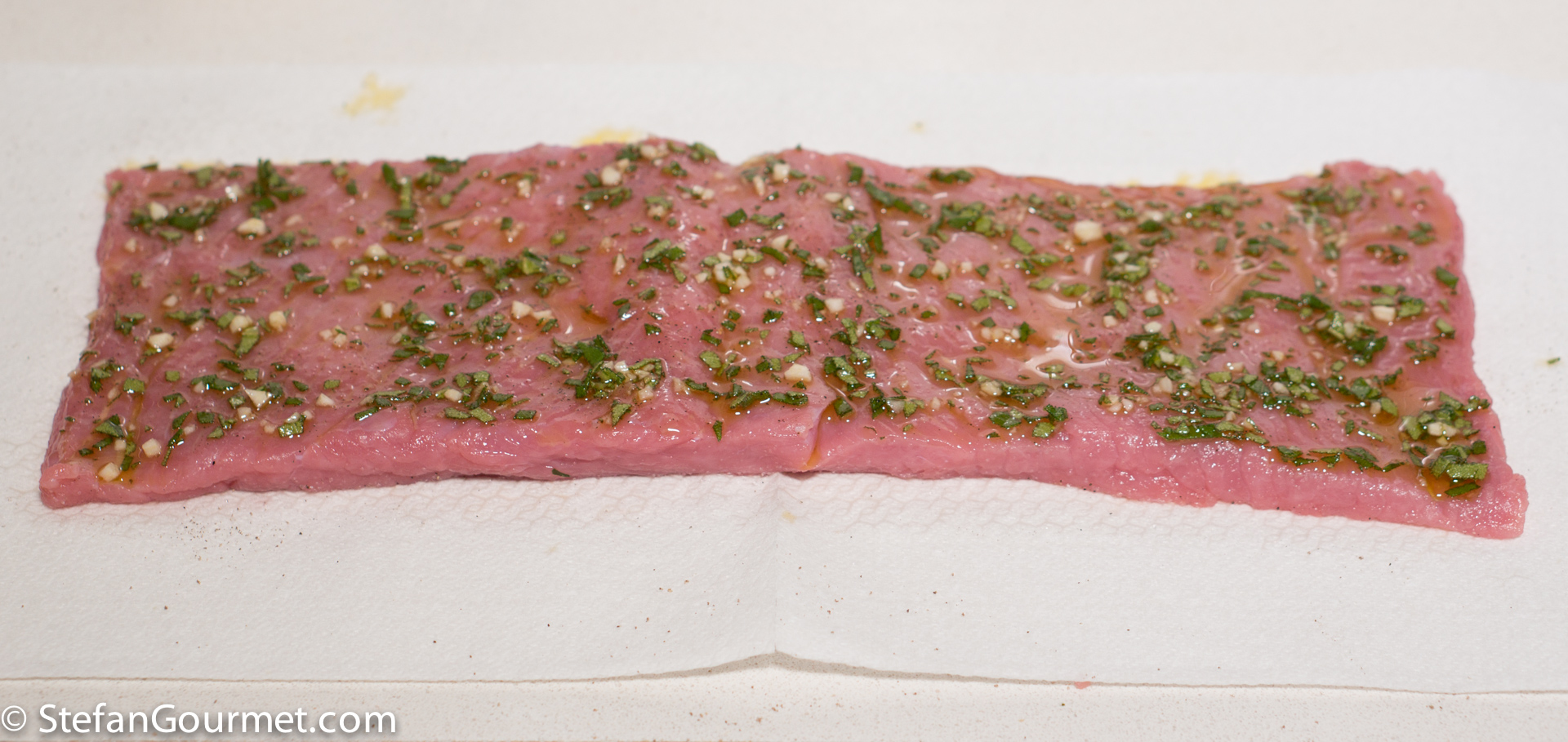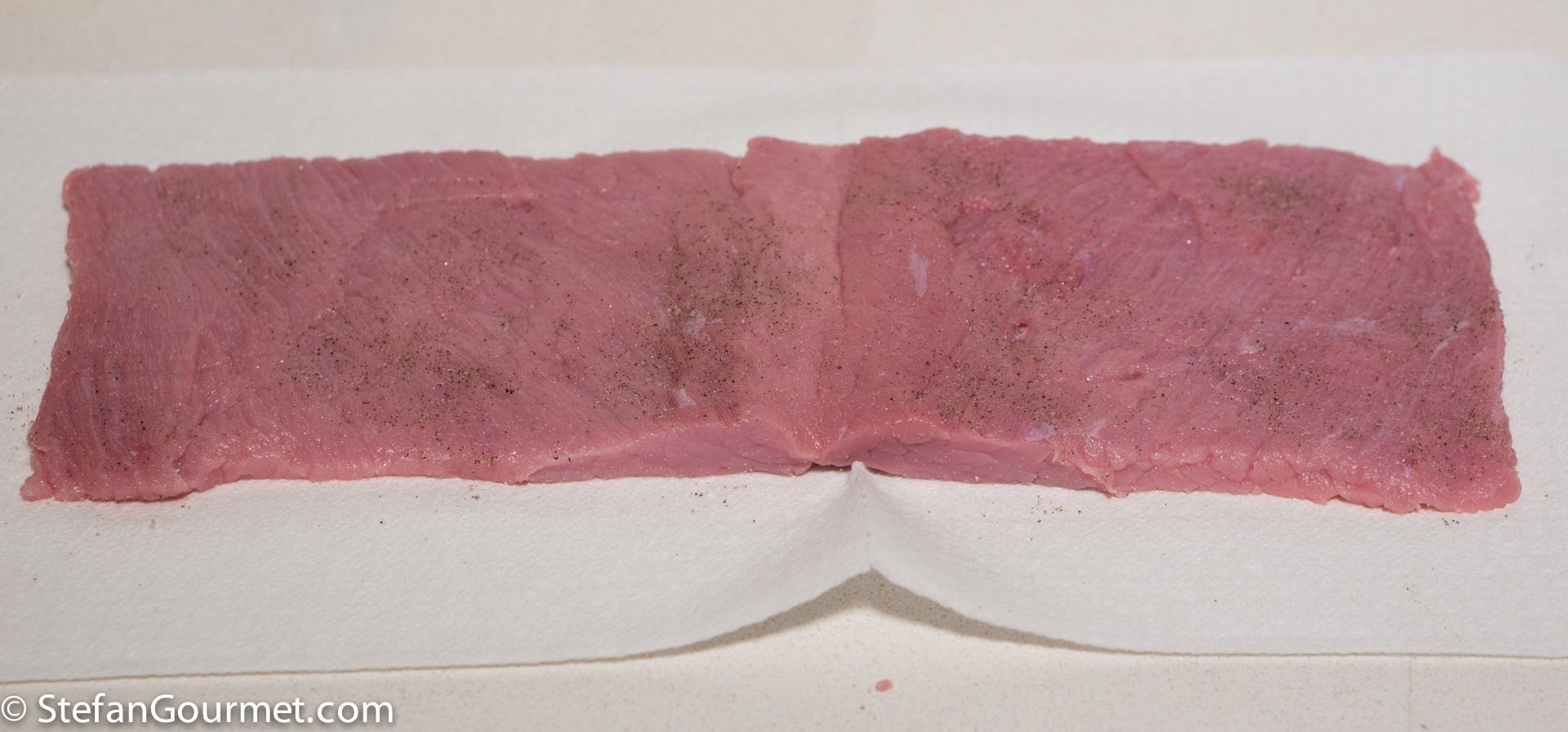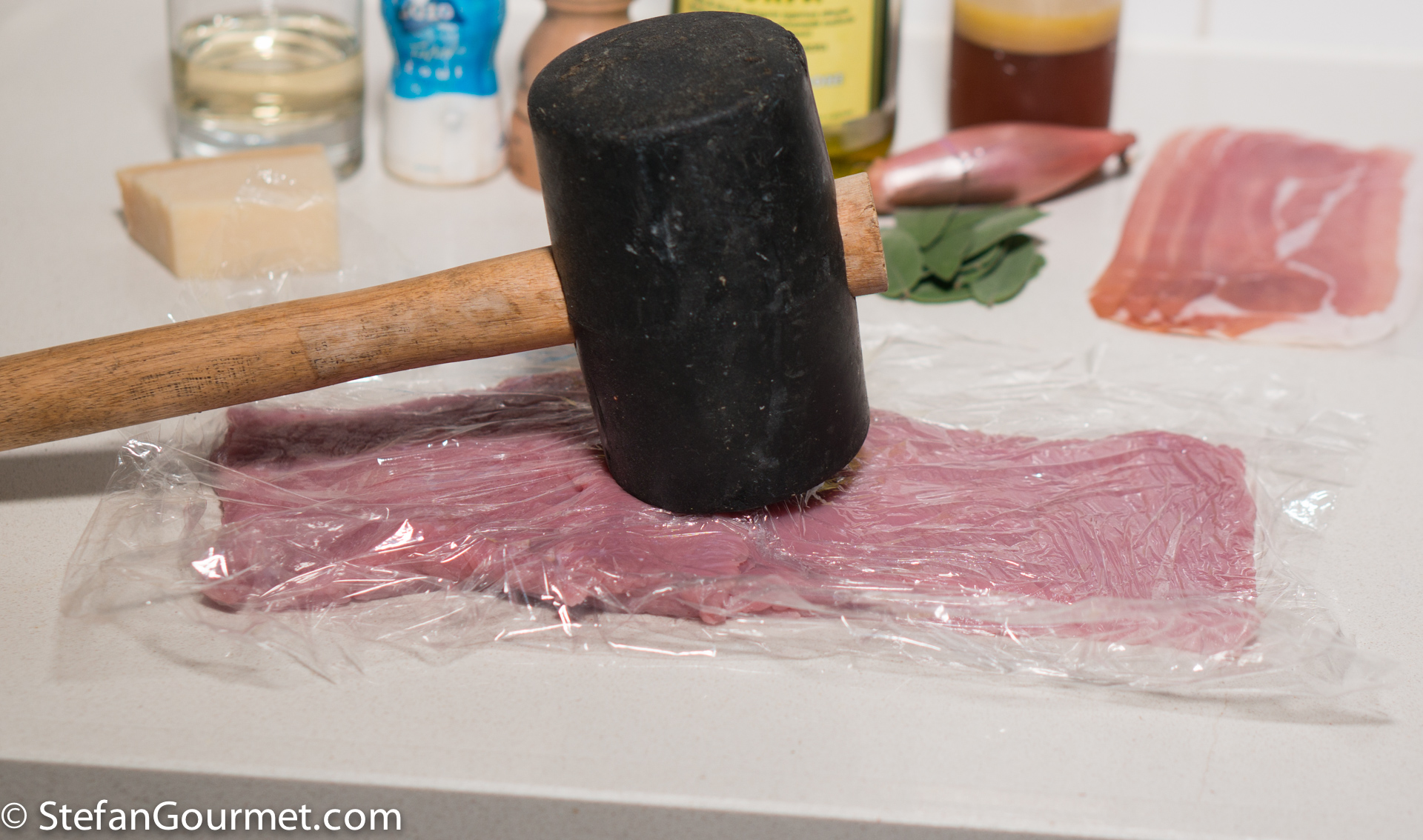 Pound it with a meat hammer between two sheets of plastic wrap if needed. The veal should be about 6 mm (1/4 inch) thick and as rectangular as possible.