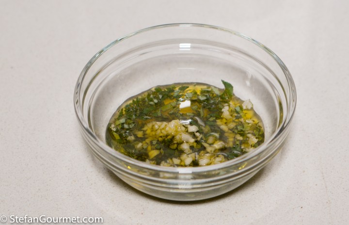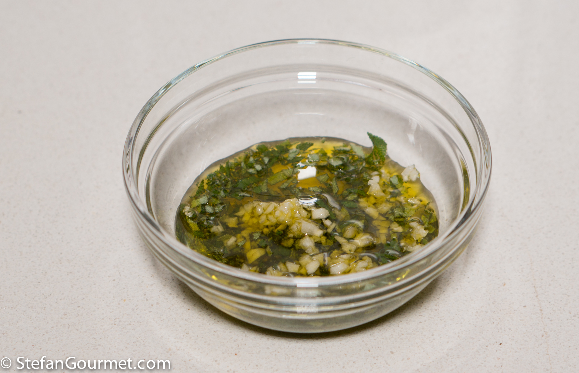Combine a tablespoon of extra virgin olive oil with a tablespoon of minced sage and a minced clove of garlic in a small bowl. Stir to mix.