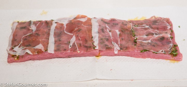 Cover with thinly sliced prosciutto.