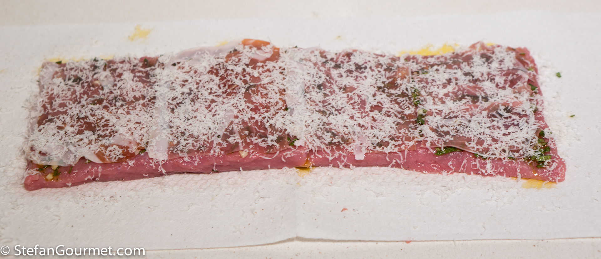 Spread this mixture on one side of the veal.