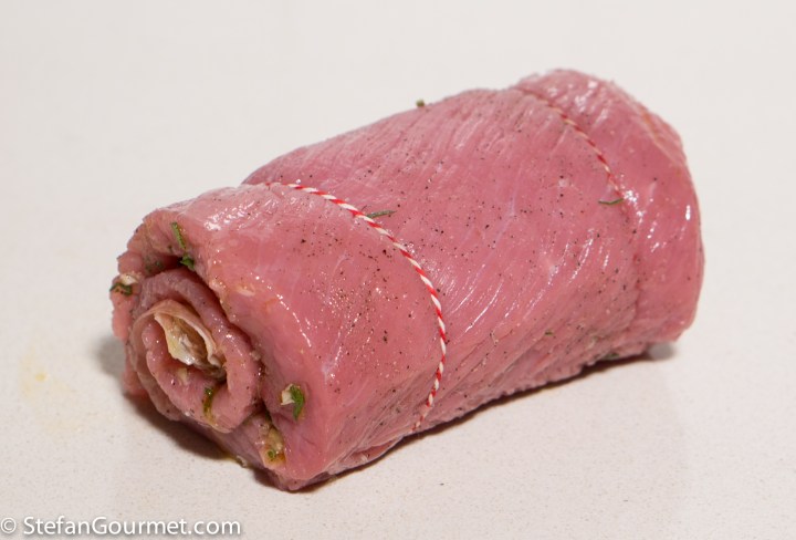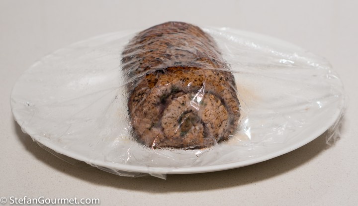 You can also cook the roulade in the oven at 150C/300F until the core temperature reaches 53C/125F. Allow to rest, wrapped in aluminum foil, for about 10 minutes before carving. The core temperature will rise to about 55C/131F while it rests.