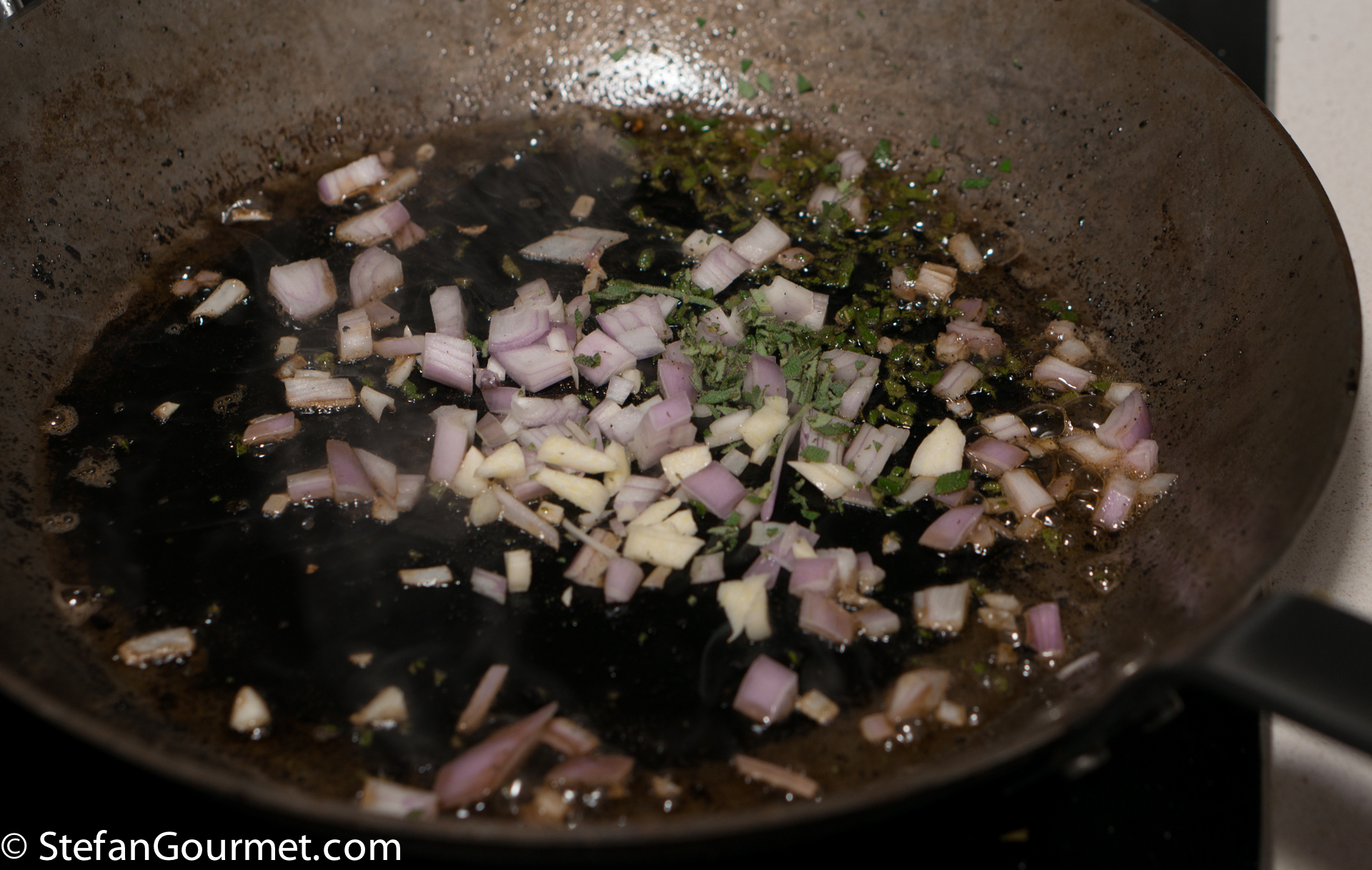 Add a minced shallot and the remaining minced garlic clove and minced sage to the drippings that remain in the pan. Season with salt.