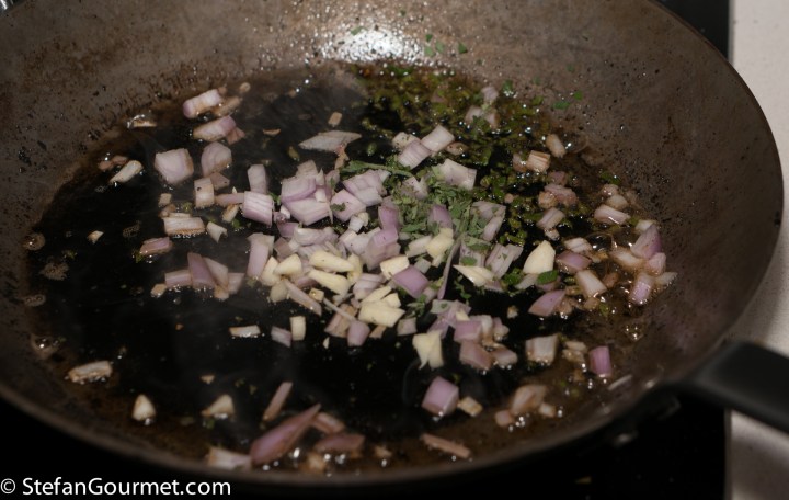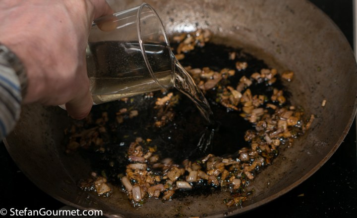 Stir over medium heat until the shallot and garlic start to color (but don’t let the garlic get too dark), then deglaze with 80 ml of dry white wine.