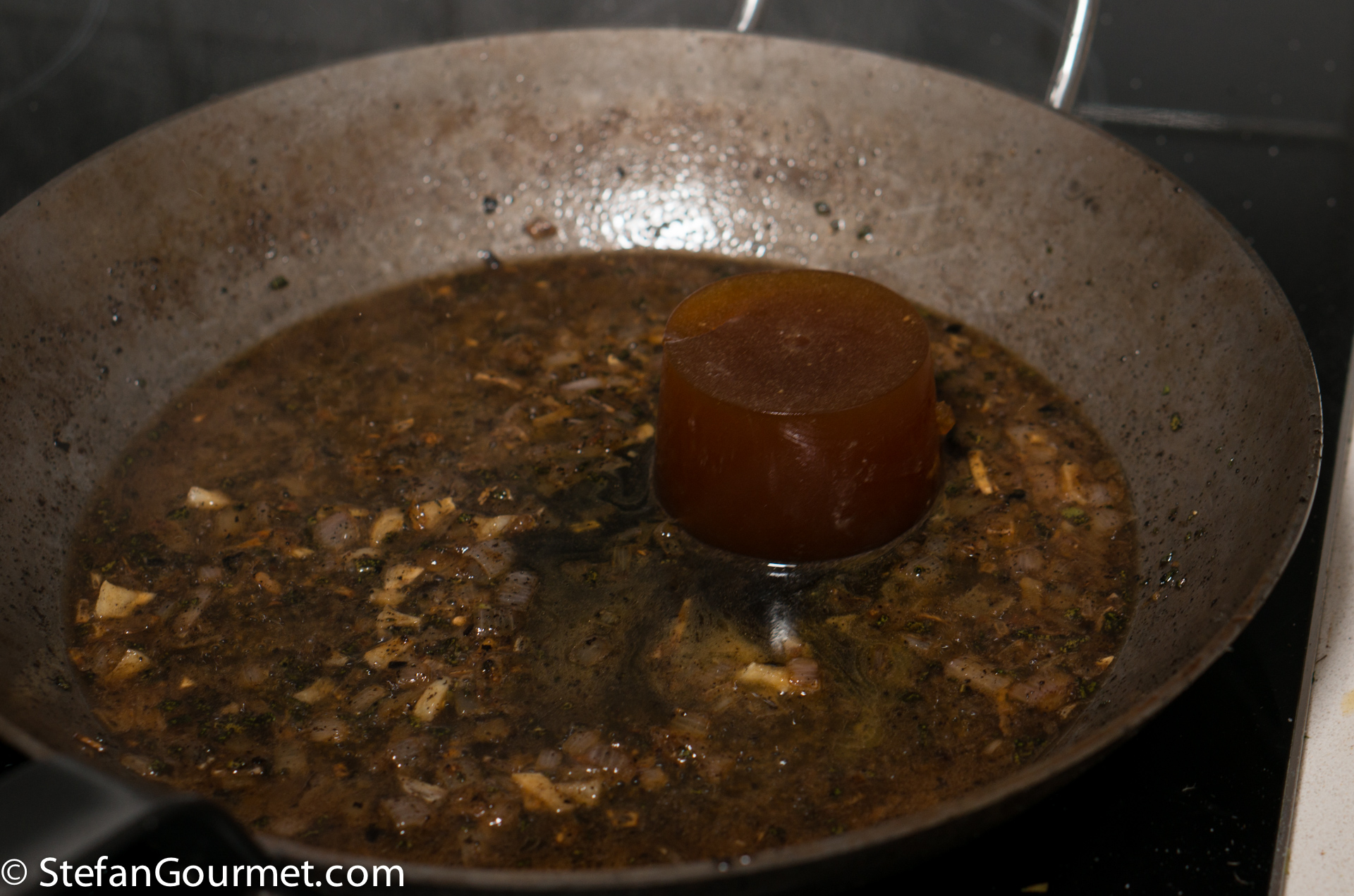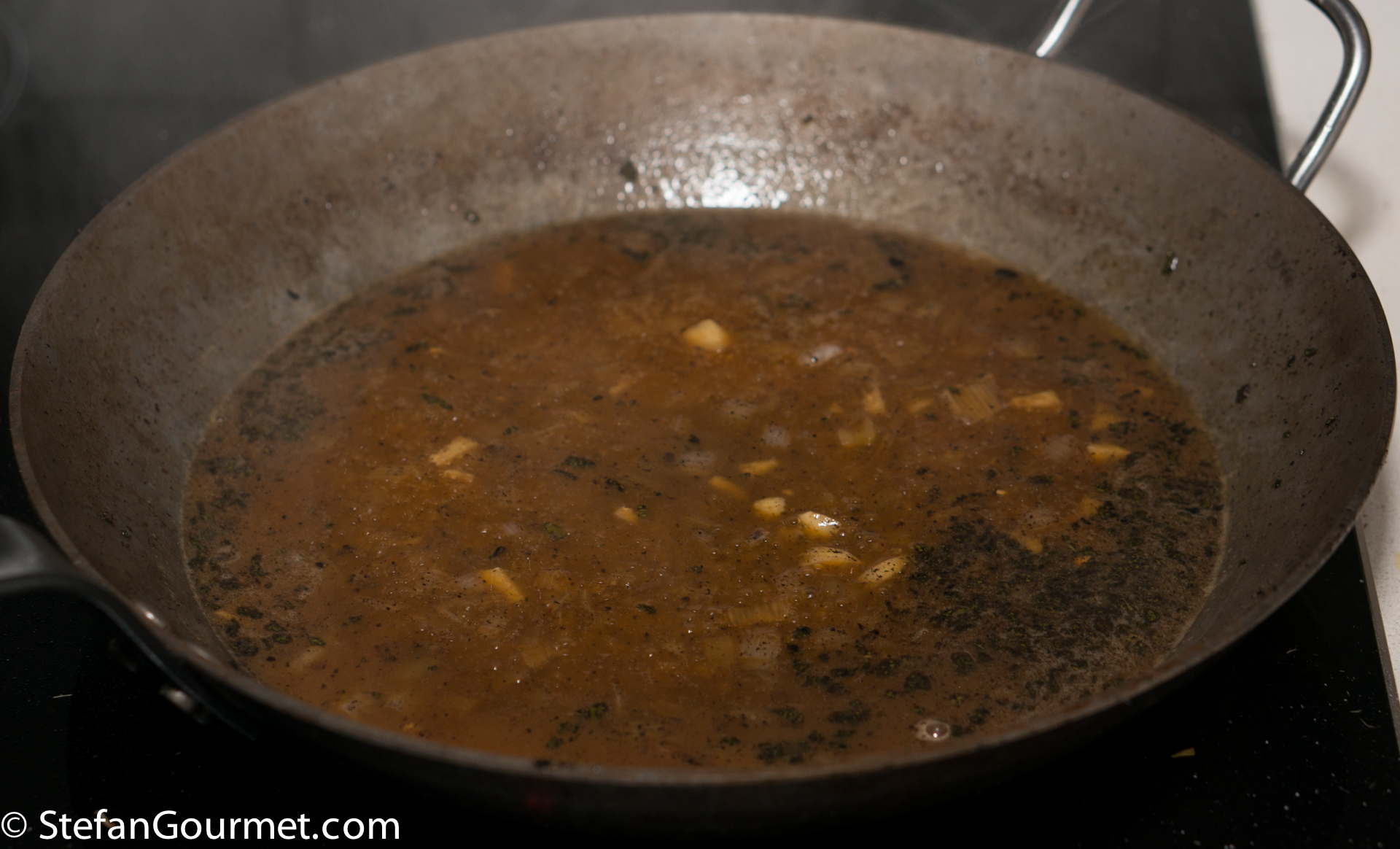 Allow half of the wine to evaporate over medium heat, then add half a litre of veal stock (note that I used veal stock that had already been reduced).