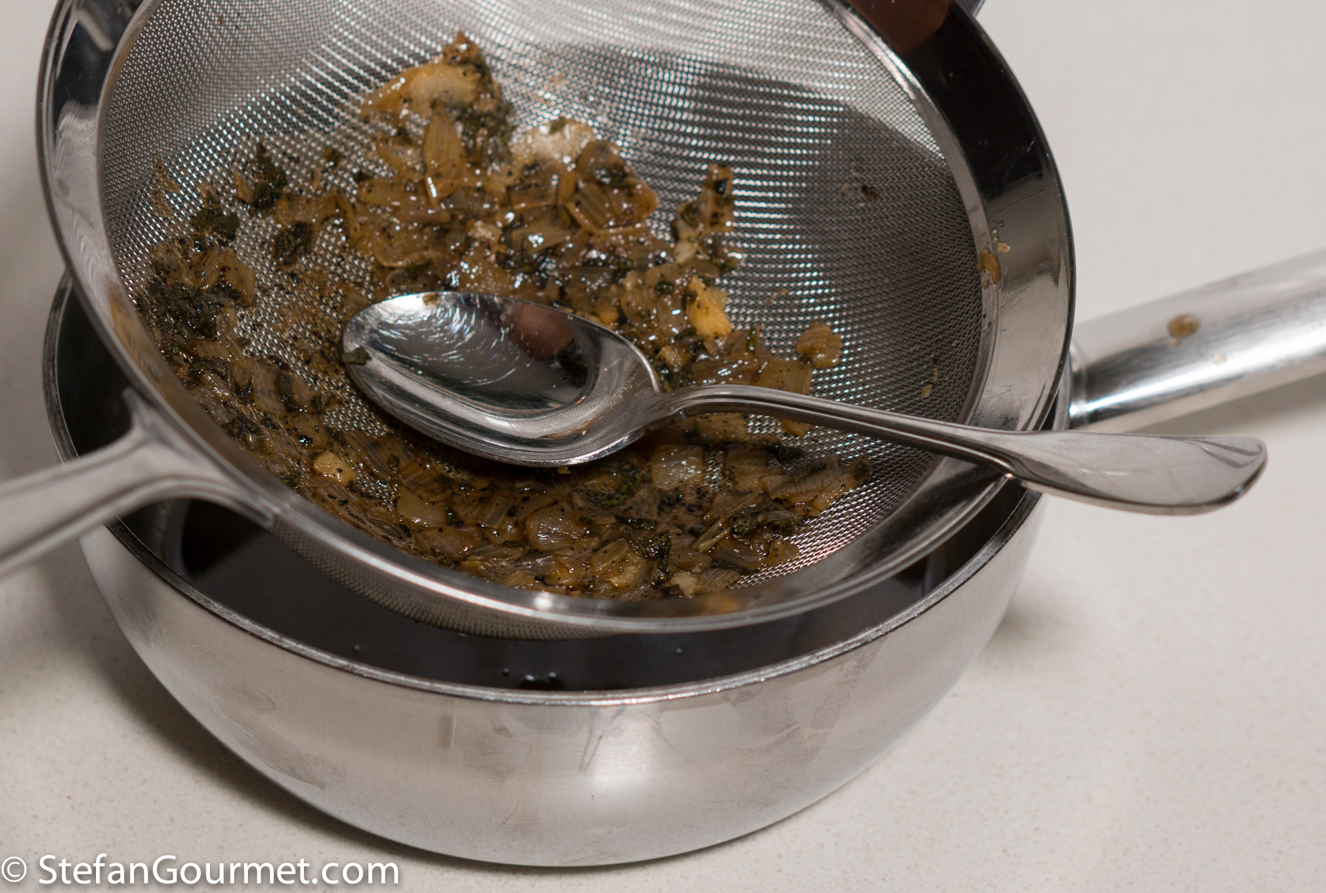 Sieve the sauce, pushing down on the solids with a spoon to get all the flavor out. Reserve the sauce.