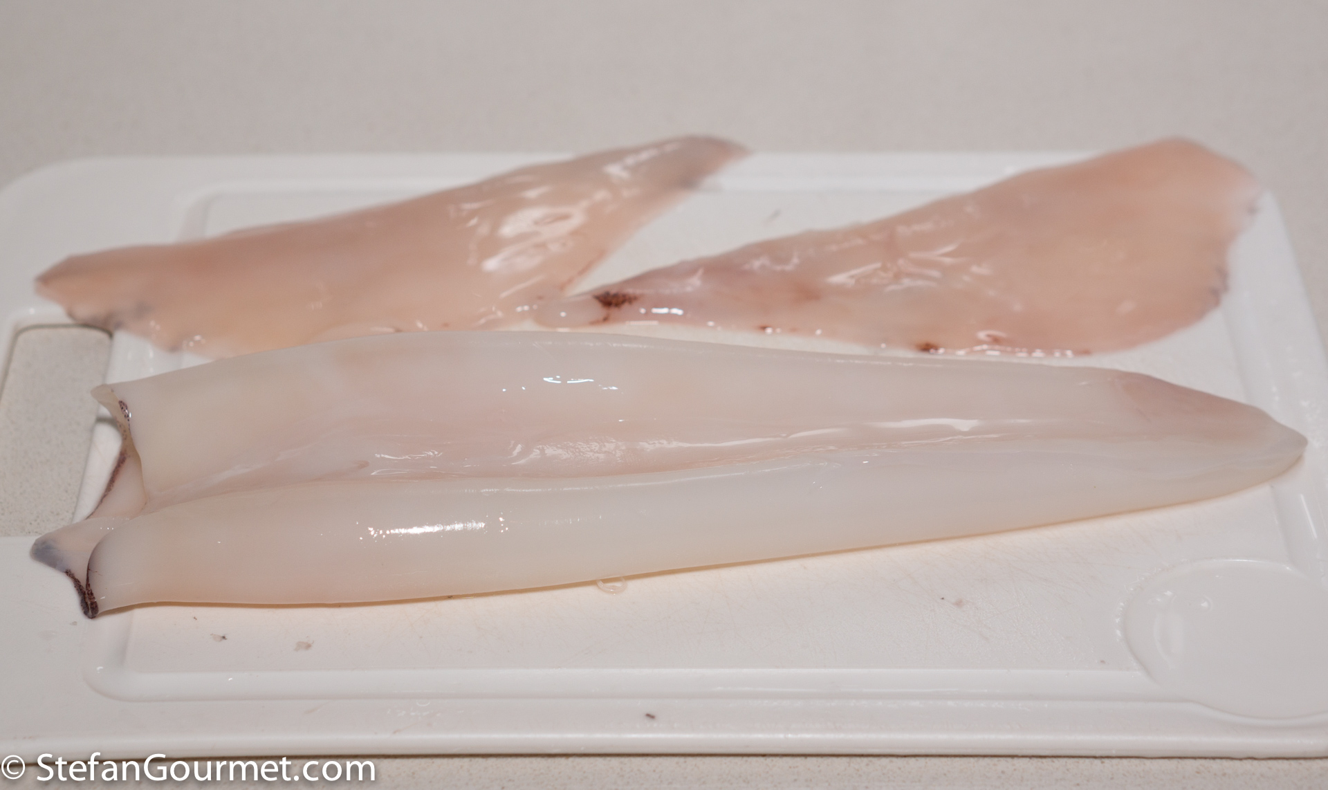 Clean the squid by removing everything that is inside the cavity and peeling off the skin. You could reserve the tentacles for another use, but discard the head with the eyes and remove the sharp beak. For this recipe we will use only the body and the wings.