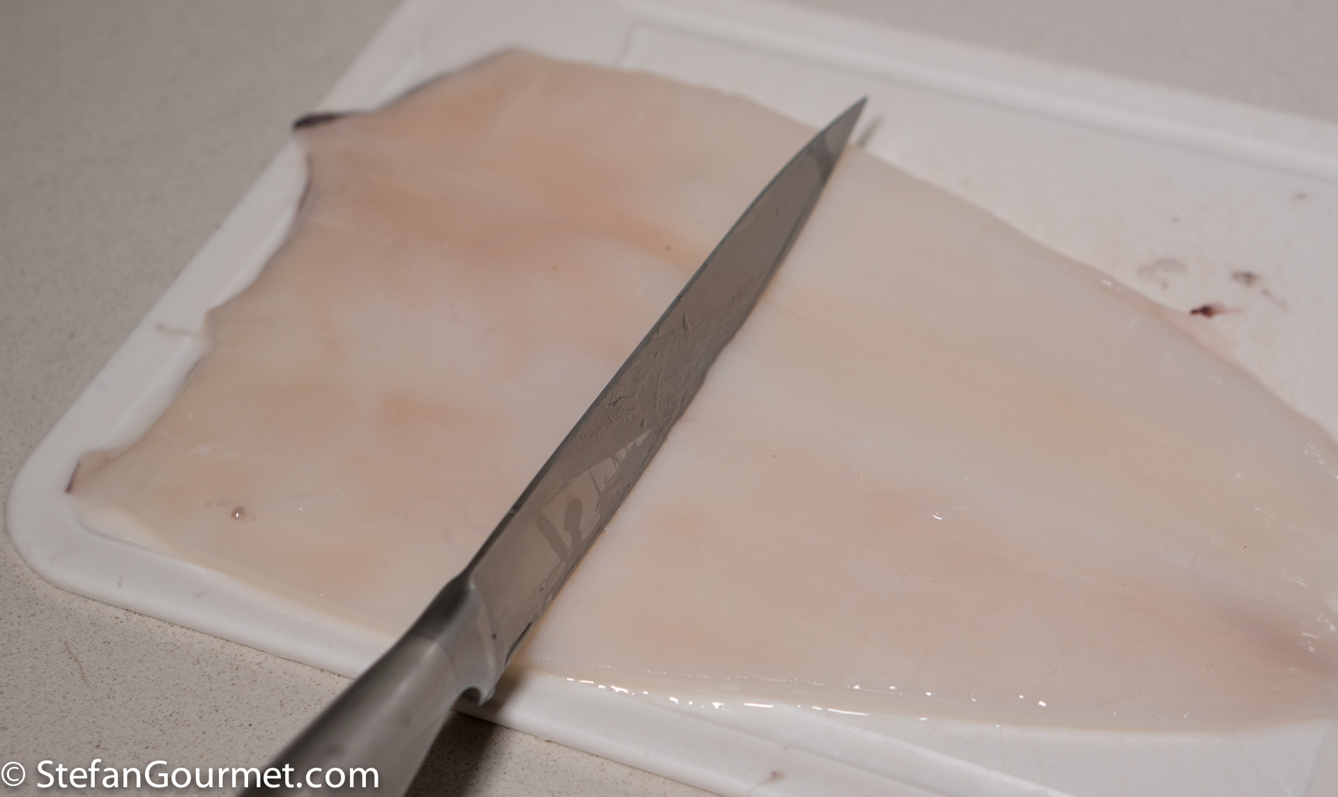 Cut open the body of the squid and lay it out flat. Score the squid with a sharp knife, being careful not to cut all the way through. The scoring makes the squid more tender. It will also look nice.