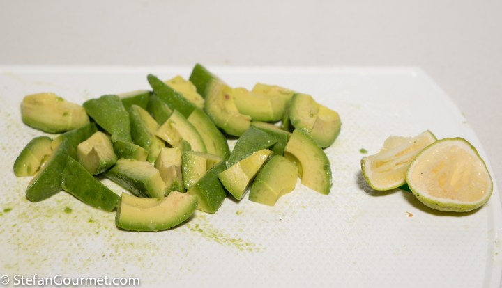Peel and chop the avocados. Rub with freshly squeezed lime juice and season with salt.
