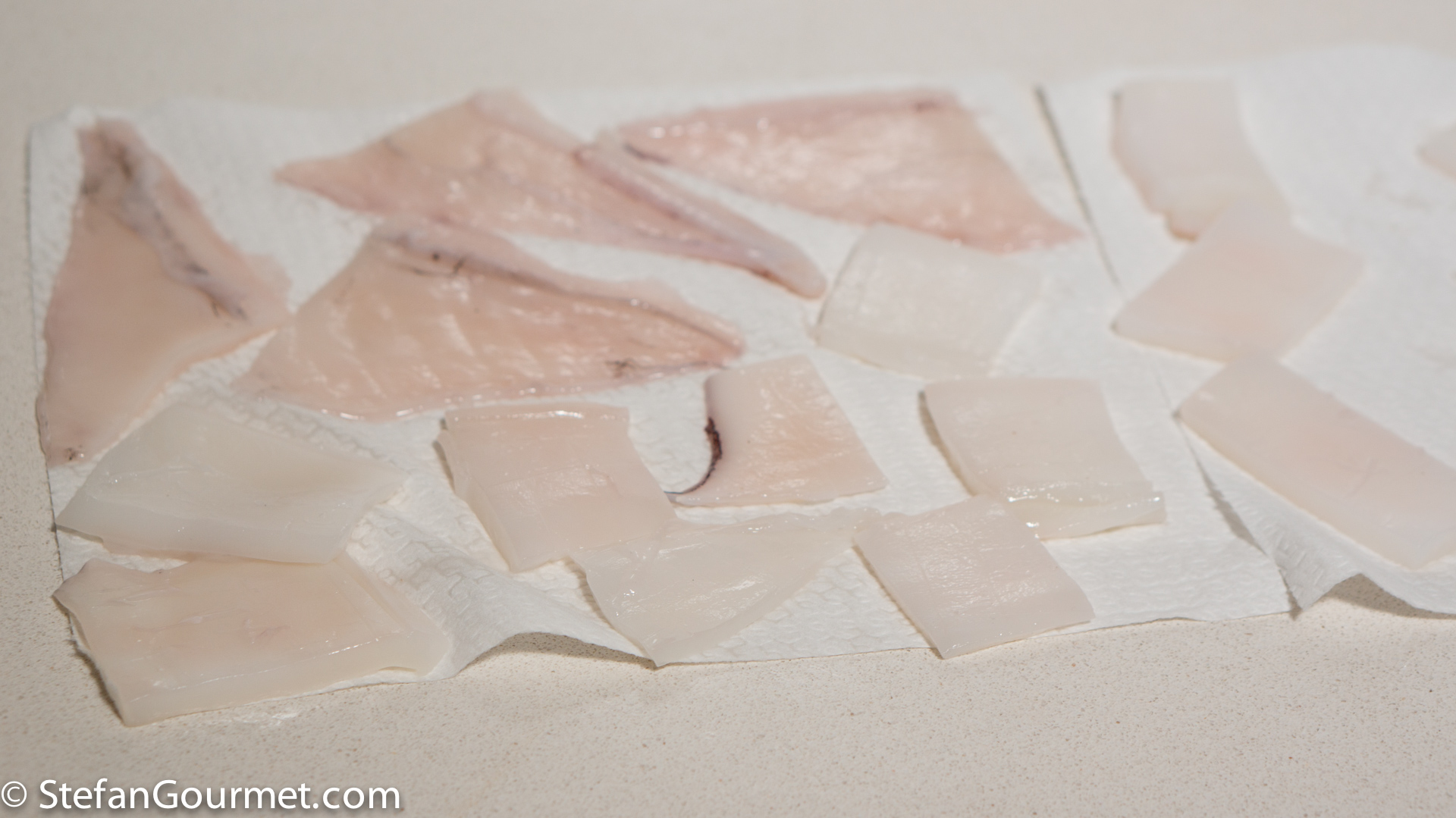 Cut the squid into smaller pieces, and pat them dry with paper towels.