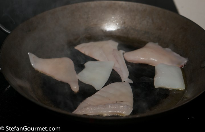 …until golden on both sides. Cook the squid very briefly, or will become tough. (Squid can be cooked either very briefly or very low and slow.) Season the squid with salt.