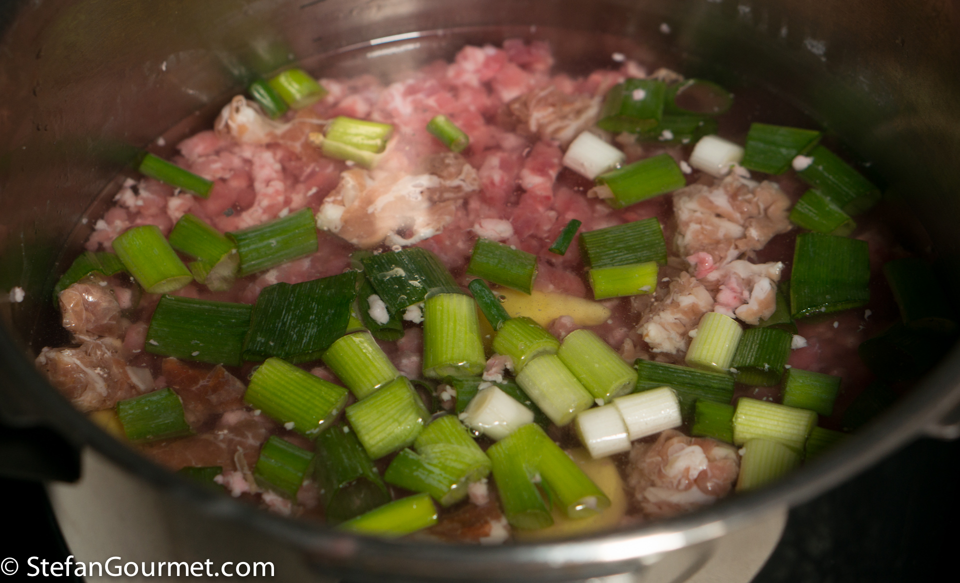 Put the pork trotters, ground pork for the soup, cured ham, green onions, white peppercorns, and ginger in a stockpot or pressure cooker. Cover with water, about 1.5 litres (6 cups). Simmer for 4 hours or pressure cook for 2 hours.
