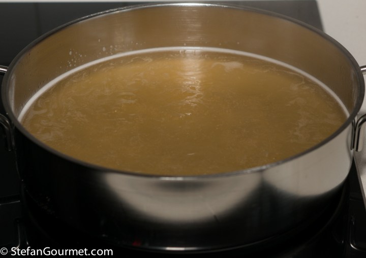 I’ve used some online recipes for inspiration, but all of them depend on adding gelatin to the soup. By using pork trotters, there will be plenty of gelatin in the soup, so there is no need to add powdered gelatin. It is best to make the soup the day before, so you can allow it to cool and remove the fat that will float on top before reducing the soup to concentrate the flavor.