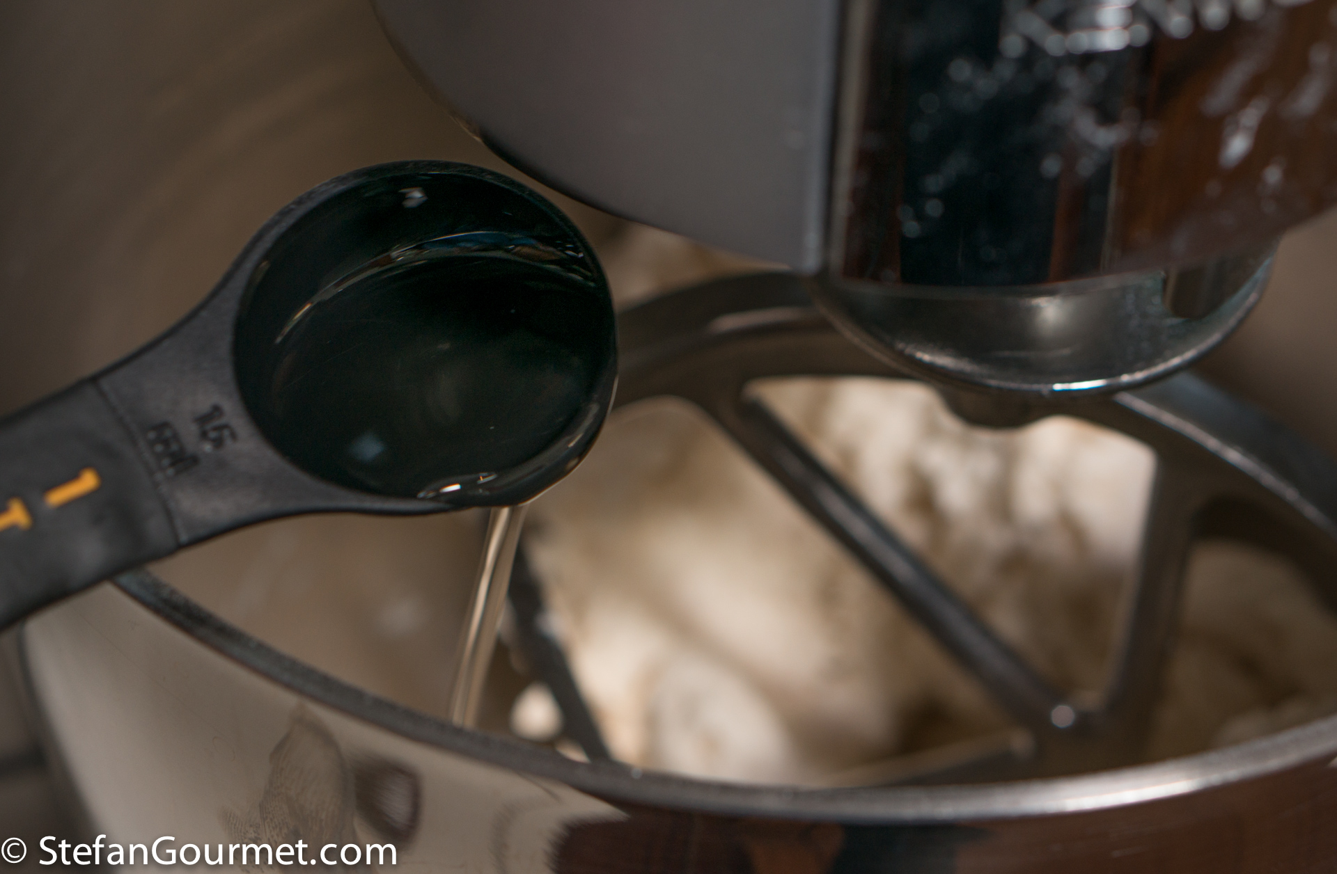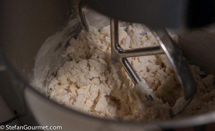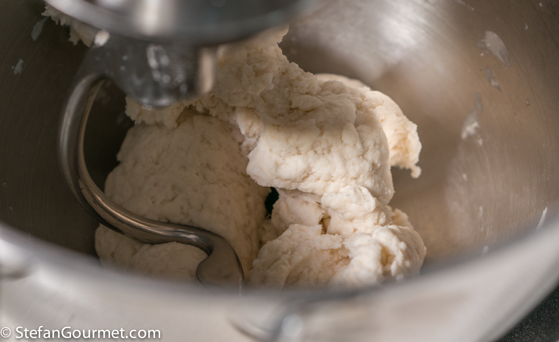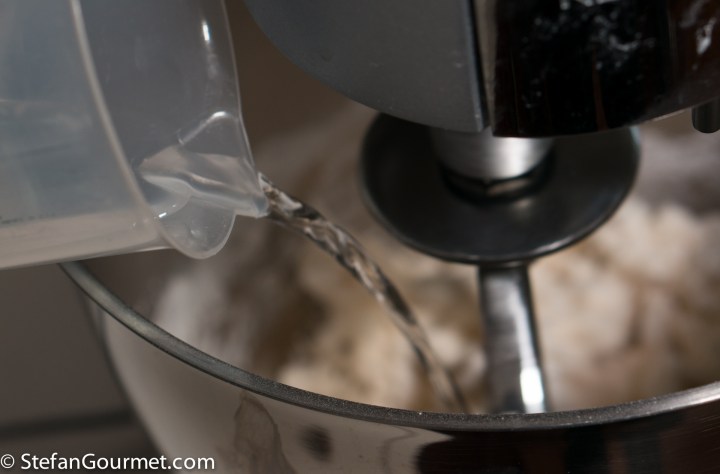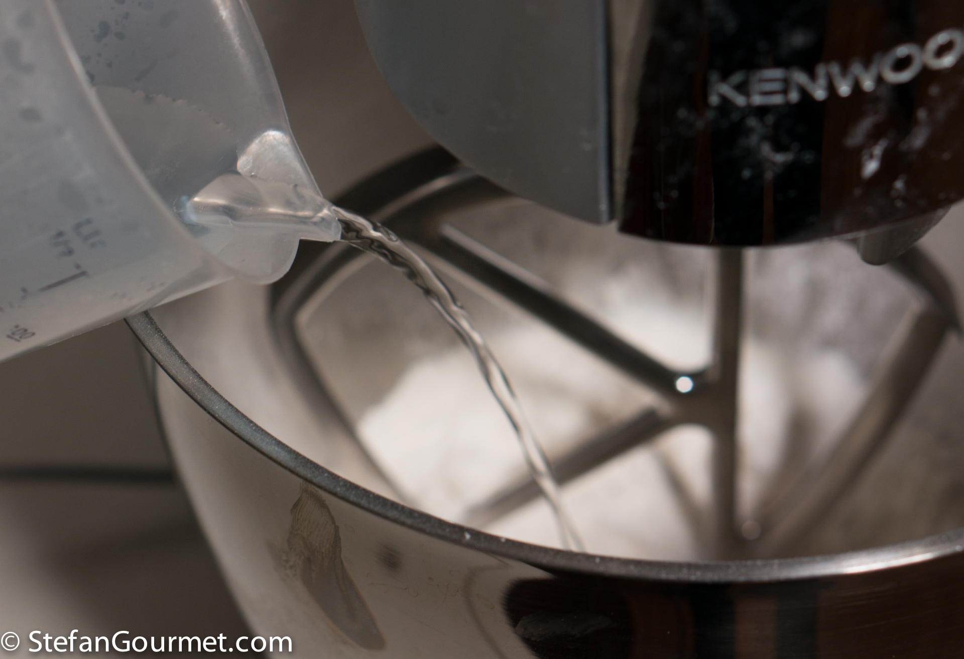To make the dough, put the flour in the bowl of a stand mixer fitted with the paddle attachment. Add 180 ml of boiling water with the machine running.