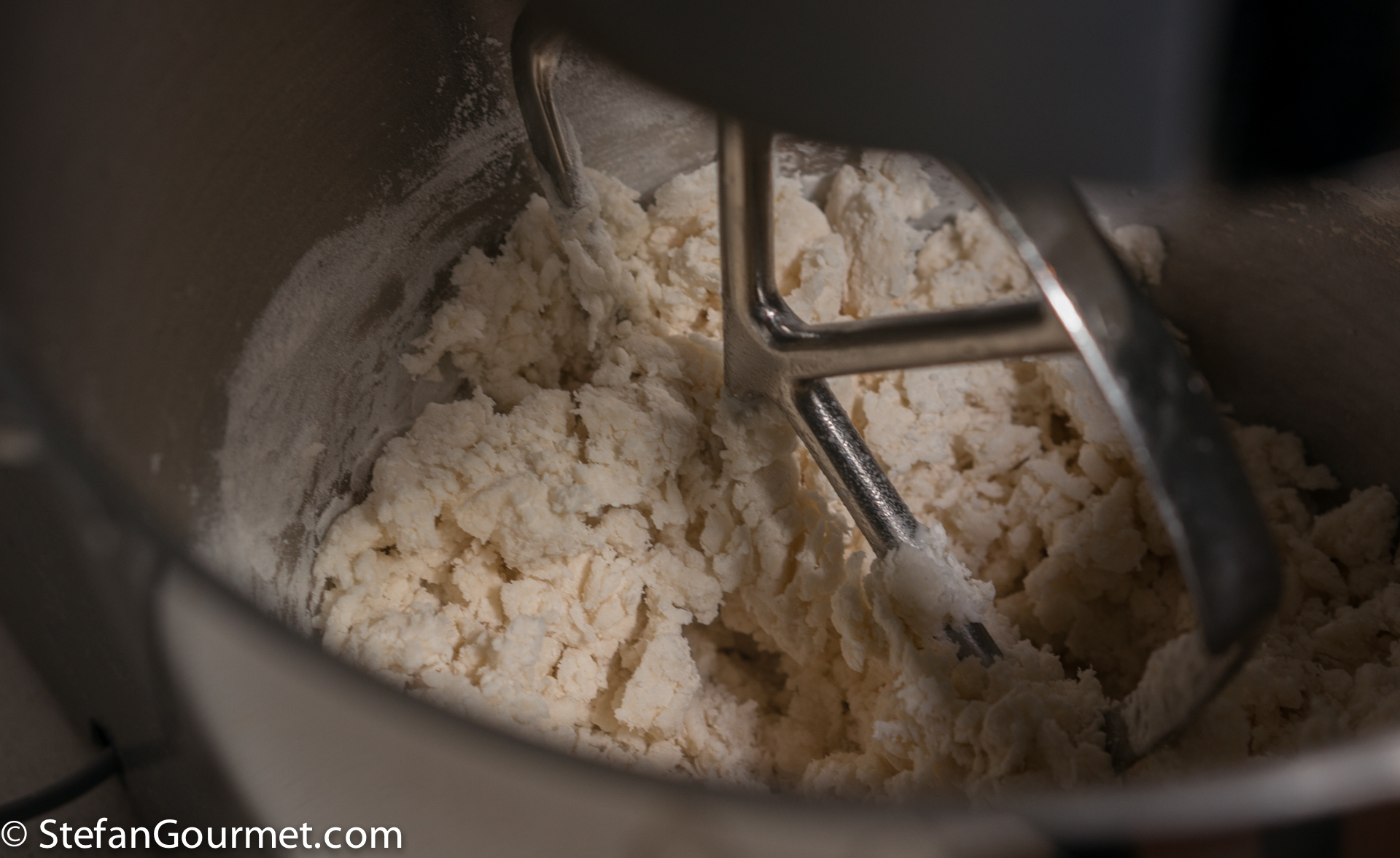 Now, with the motor still running, add just enough cold water, about 60 ml or 1/4 cup, to allow the dough to come together.