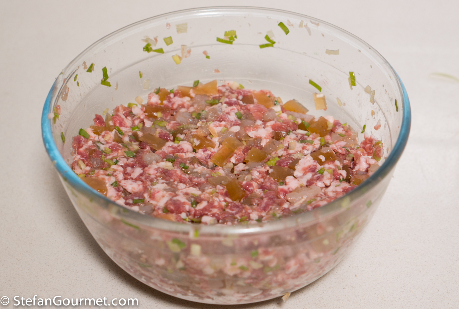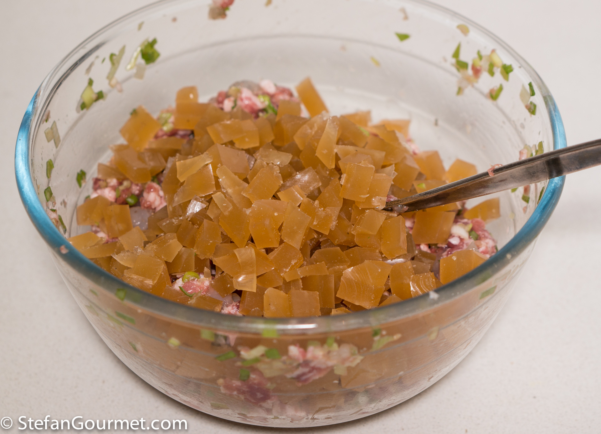 This is the first of a series of dishes that we really enjoyed in Taiwan and I wanted to recreate at home: dumplings that have soup in them, that will burst open in your mouth as you eat them. They are quite a bit of work to make, but oh so worth it. The trick to getting the soup inside the dumpling is to make pork stock with plenty of gelatin and then cool it until it sets. The stock is now solid and can be added to the filling of the dumplings. When the dumpling is steamed, the soup will become liquid again. We had these a couple of times in Taiwan, and loved them every time. This homemade version is at least as good.