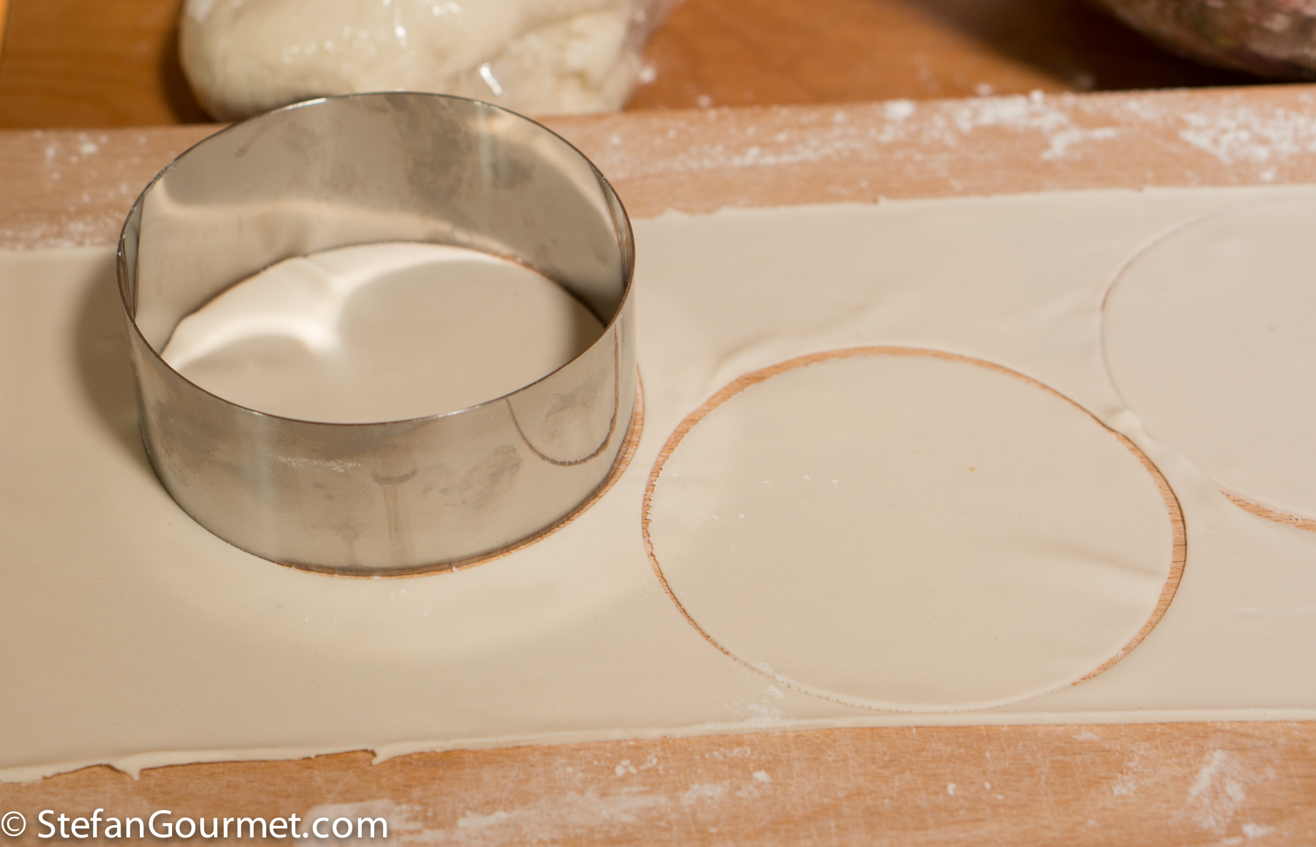 The traditional way is to roll out individual round sheets of dough that are thicker in the center than at the edges. I took a shortcut and used my pasta maker to roll out the dough to the thinnest setting and then use a 10 cm (4″) cookie cutter to cut out circles of dough. Gather the trimmings and combine them with the remaining dough.
