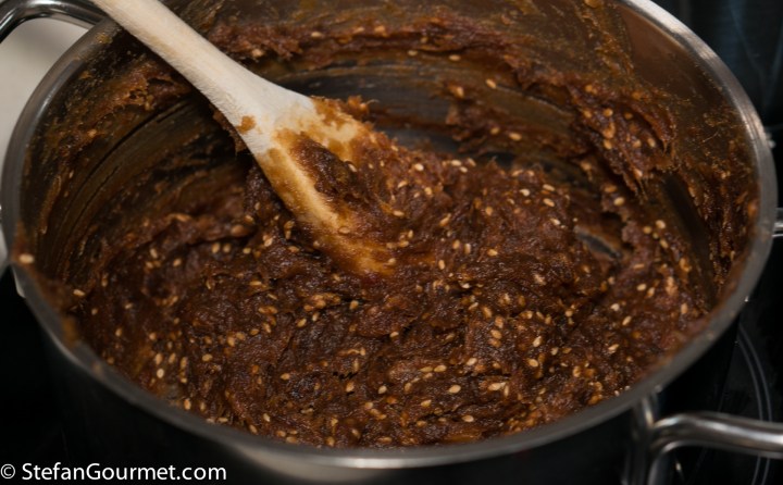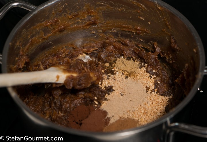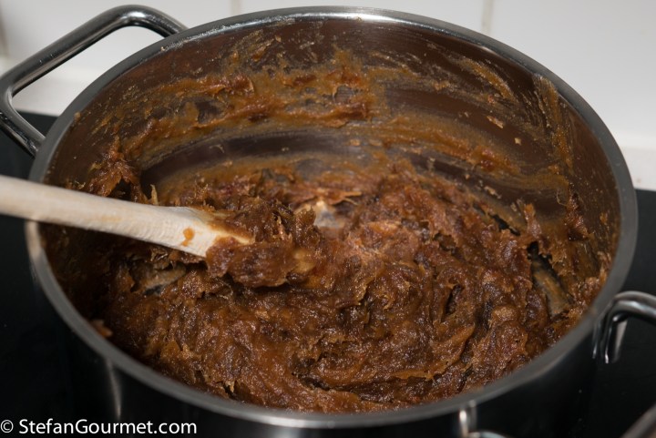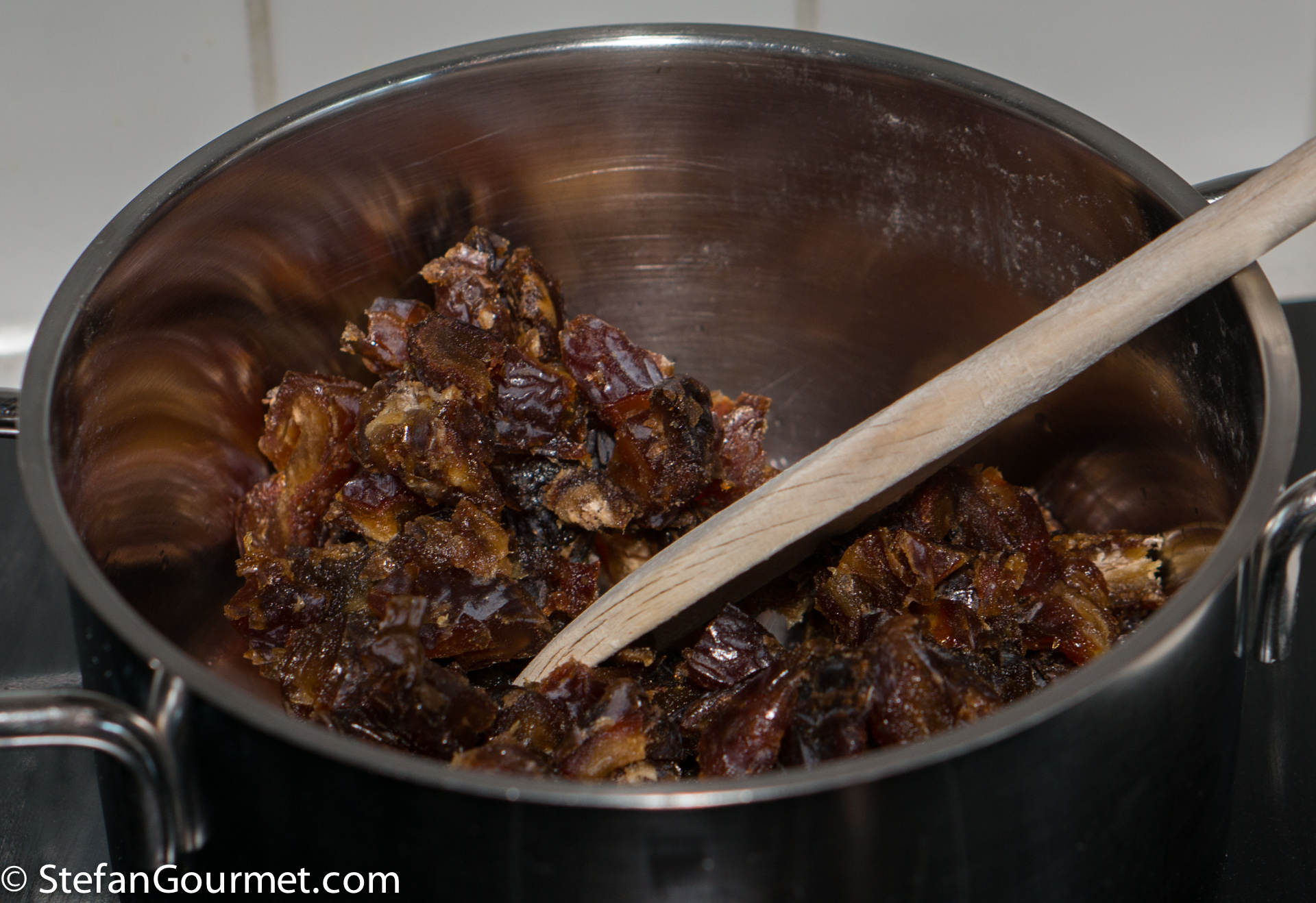 Meanwhile, prepare the date filling. Pit the dates and chop them roughly.