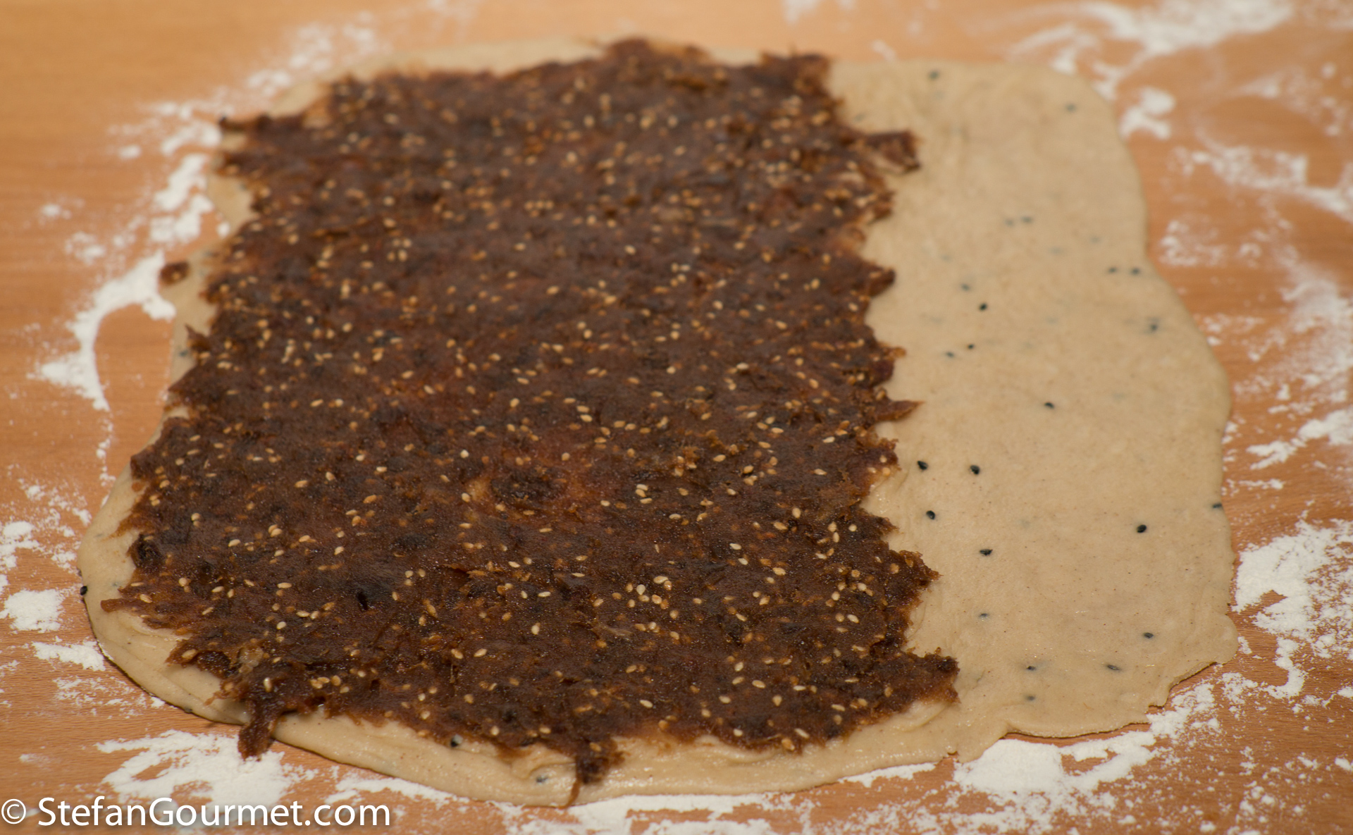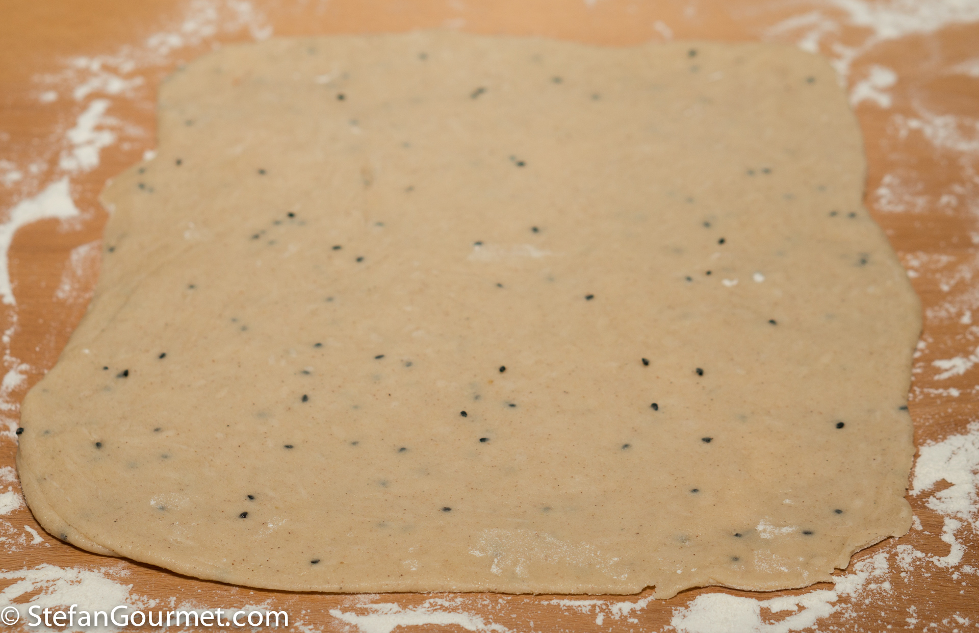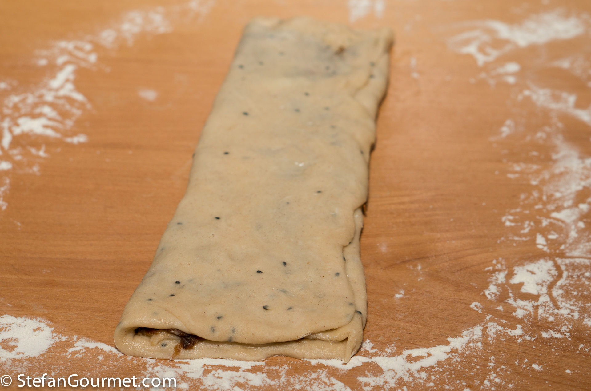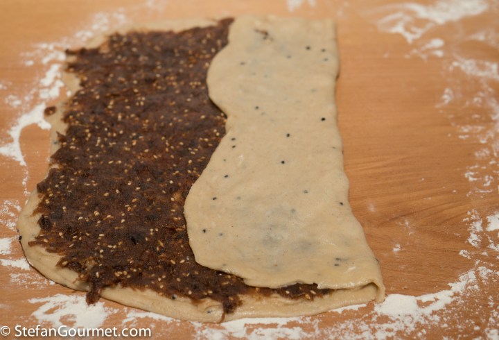 Divide the dough and the filling into two equal portions. Take the first half of the dough and roll it out on a floured work surface to a rectangle of about 30 * 20 cm (12 * 8 inches). To roll out dough into a rectangular shape, make sure to roll out also on the diagonal.