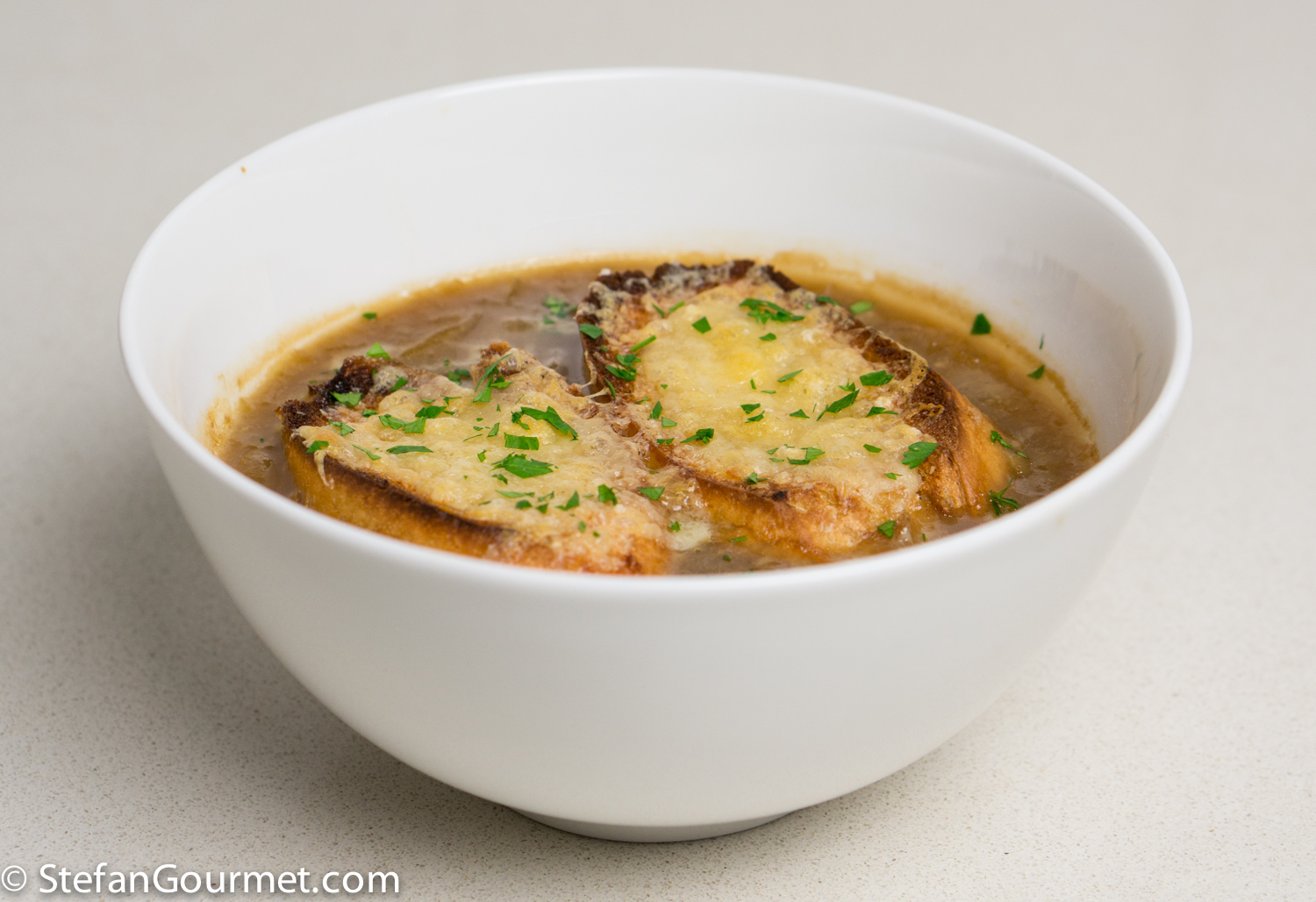 This is my recipe for traditional French onion soup that (apart from the bread and cheese on top) is made from only onions, water, salt, pepper, butter and a bit of flour. No beef stock. It is a chore to brown the onions, but it has great flavor.