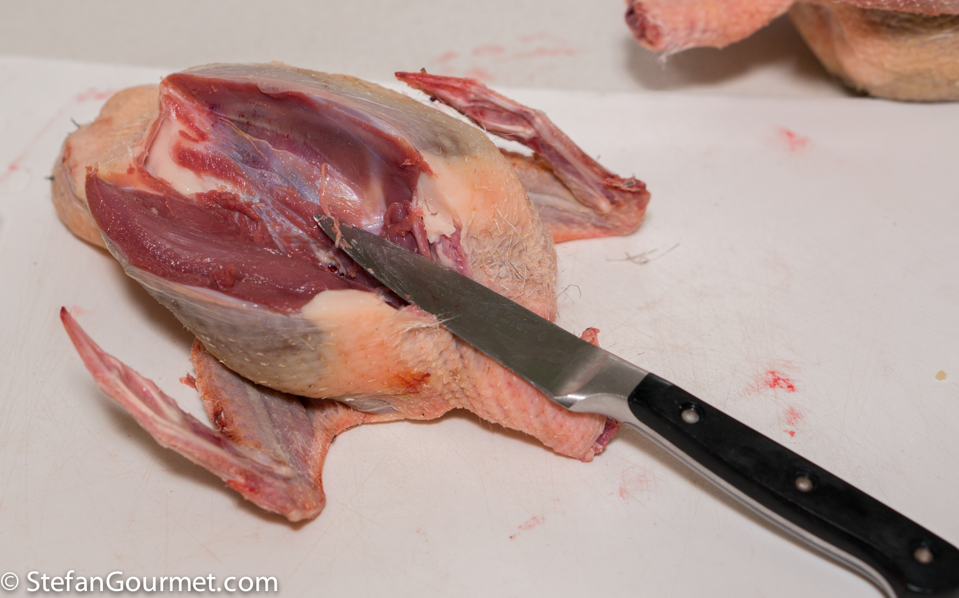 Cut along the breastbone to remove the breast fillets of the squab. Cut off the legs as well.